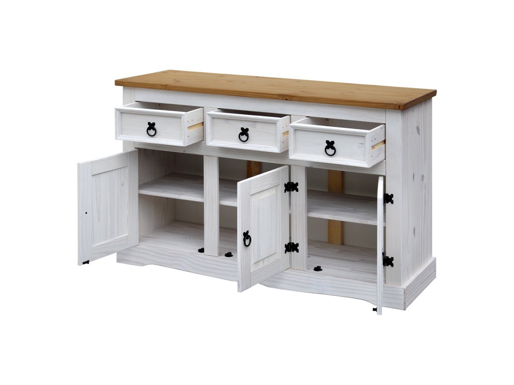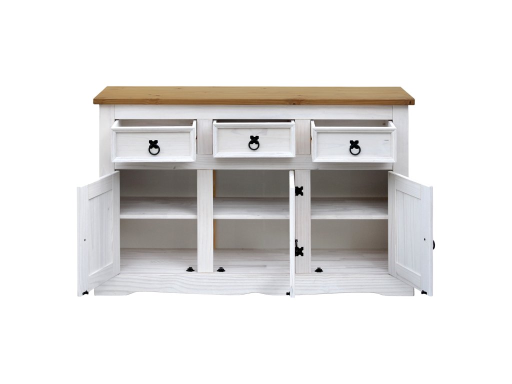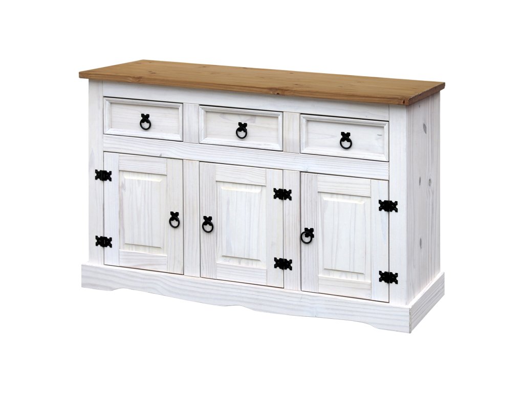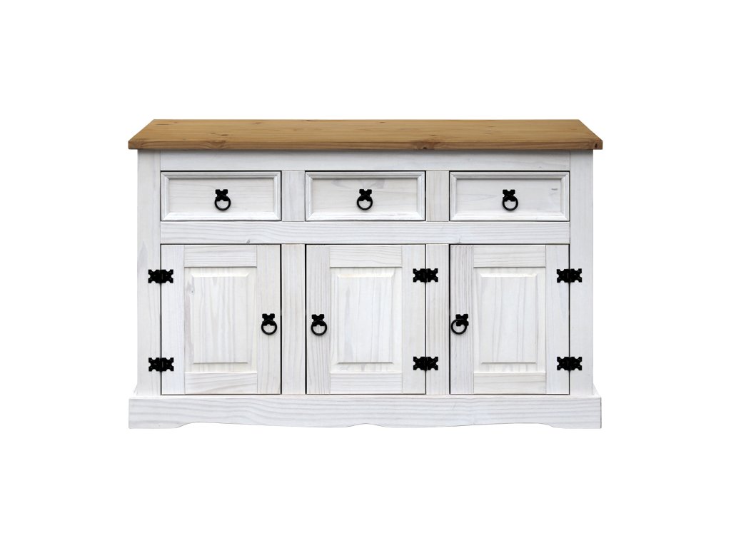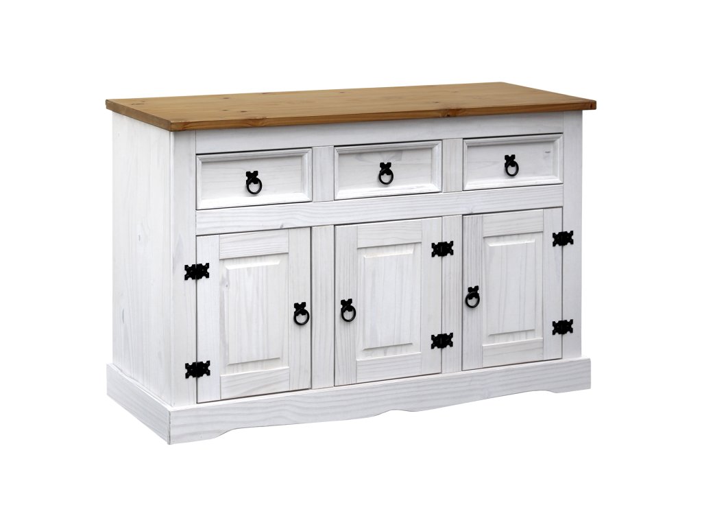 materiál masiv borovice voskovaná v bílém odstínu horní deska masiv borovice voskovaná v medovém odstínu 3 malé zásuvky, 3 dvířka, 1 police, kovové ozdobné úchytky rozměr zásuvky (š/h/v) 31 × 31,5 × 12 cm součást sestavy Corona bíláDoplňkové parametry