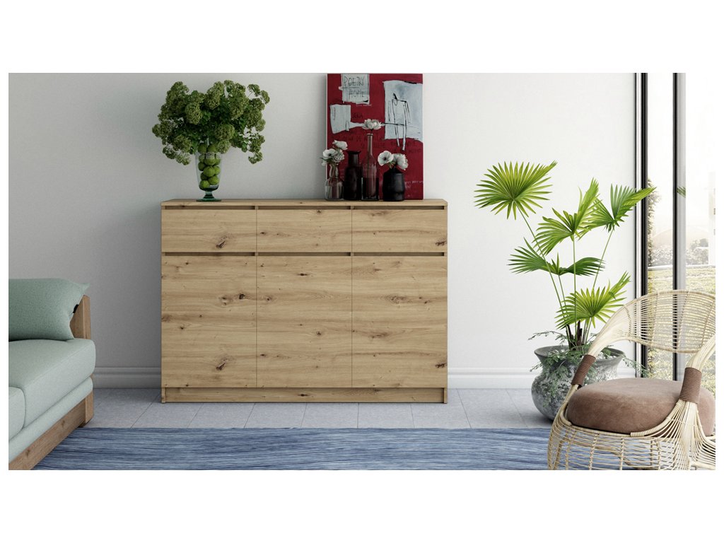 Funkční a prostorná komoda Malvína v nadčasovém elegantním designu ozdobí každý prostor vašeho domu či bytu. Pohodlná bezúchytková čela zásuvek a dvířka podtrhnou moderní charakter interiéru. Komoda je vyrobená z kvalitního 16 mm lamina, hrany jsou zakončené vysoce odolným ABS materiálem.