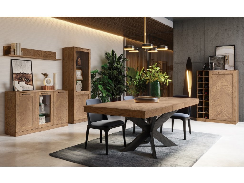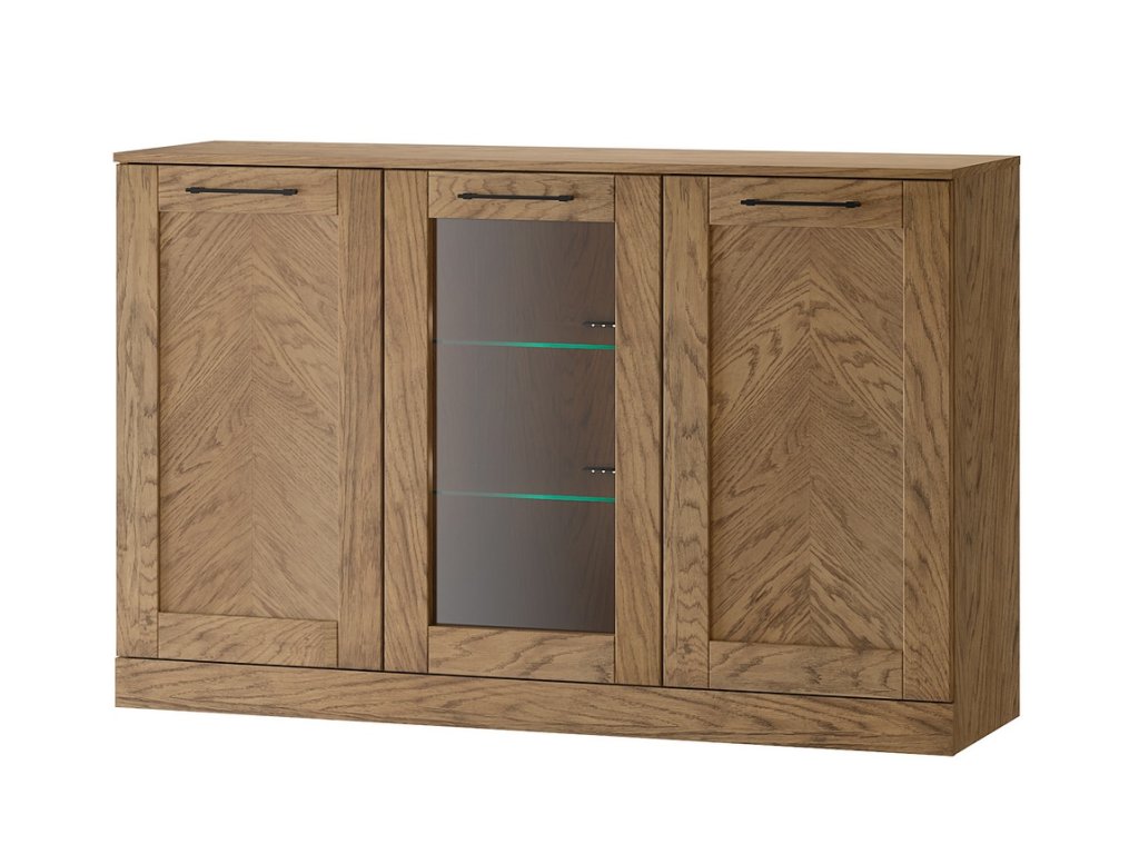 Komoda třídveřová v nadčasovém provedení. Korpus je vyroben z přírodní dýhy v barvě dub rustikální, dvířka jsou vyrobeny z masivu v kombinaci s přírodní dýhou v zajímavém dekoru rybí kost v provedení dub rustikální olejovaný. Součástí komody je také LED osvětlení prosklené části. Úchyty jsou kovové v barvě černá mat. Dvířka disponují systémem tichého dovírání. Dodáváme již ve smontovaném stavu.Doplňkové parametry