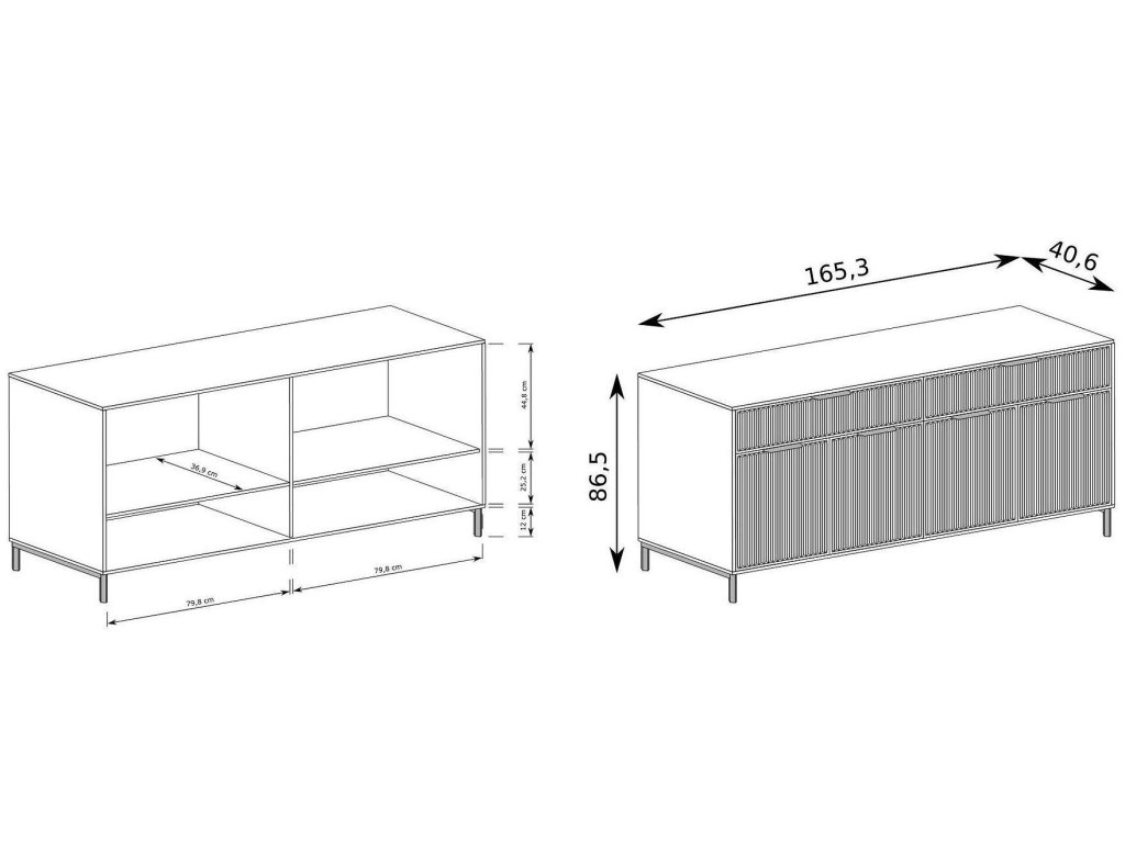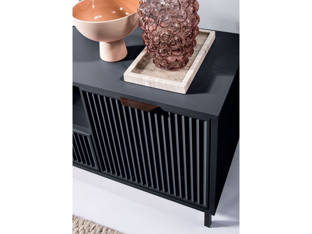 Nábytek je zdoben vzorem na čelních stranách v podobě frézovaných drážek. Všechny kusy nábytku z této kolekce stojí na černých kovových nožkách. Jednoduché a funkční tvary se hodí do obývacího pokoje, ložnice i jídelny.