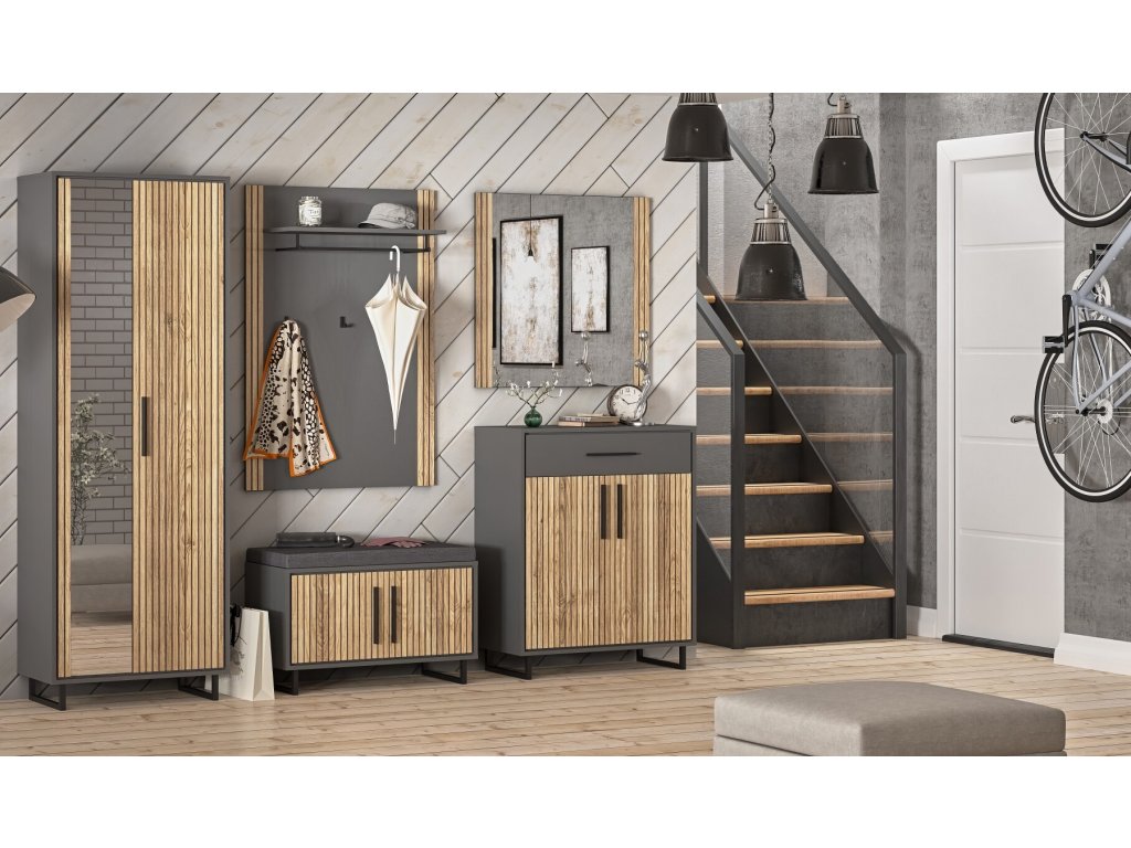 Komoda dvoudveřová se dvěma zásuvkami v industriálním stylu je vyrobena z LTD desky, korpus je v barvě šedé, přední část dvířek je doplněna lištami z přírodního dubového dřeva. Nohy jsou kovové černé. Nábytek disponuje teleskopickými pojezdy a systémem samodovíracích závěsů. Nabídka komponentů této sektorové řady umožňuje sestavit si nábytek dle vlastních představ. Dodáváme v demontovaném stavu.Doplňkové parametry