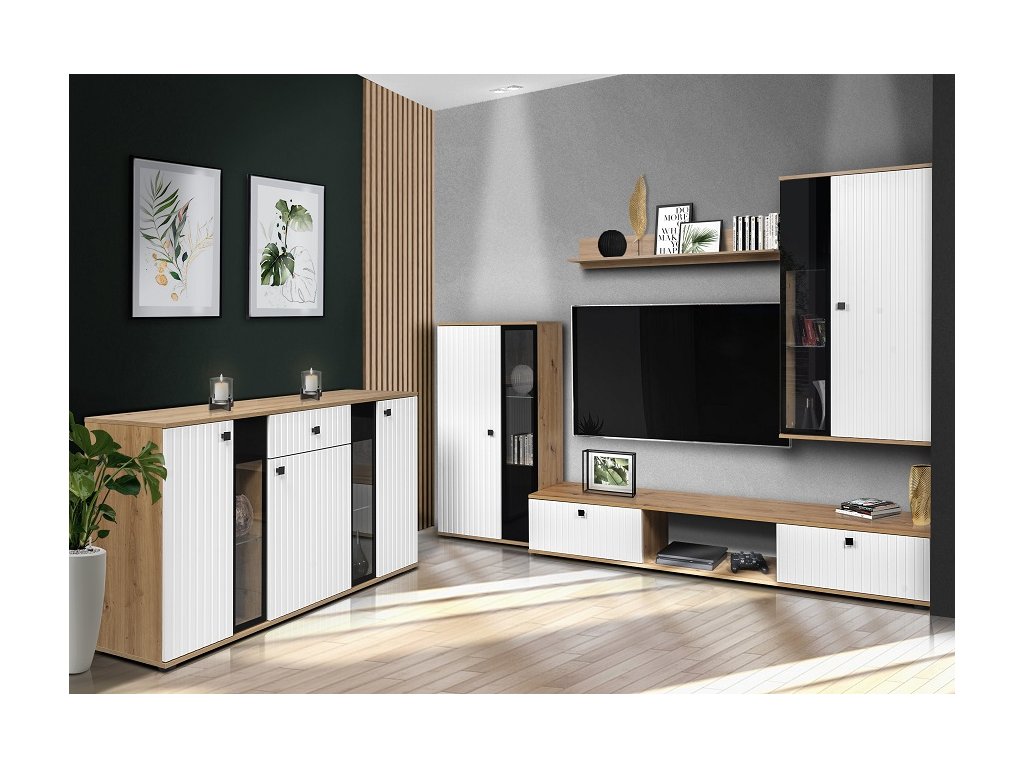 Komoda v moderním stylu. Komoda je částečně prosklená, má 3 dvířka a 1 praktickou zásuvku. Barevné provedení bílá/dub artisan. Tato komoda krásně doplní obývací stěnu, kterou rovněž najdete v naší nabídce. Nábytek je vyroben z kvalitního lamina. Přední část komody je vyrobena z kvalitní MDF desky tloušťky 16 mm. Korpus je z LTD desky, tloušťka 15 mm. Sklo ve vitríně je čiré. Dodáváme v demontovaném stavu.Doplňkové parametry