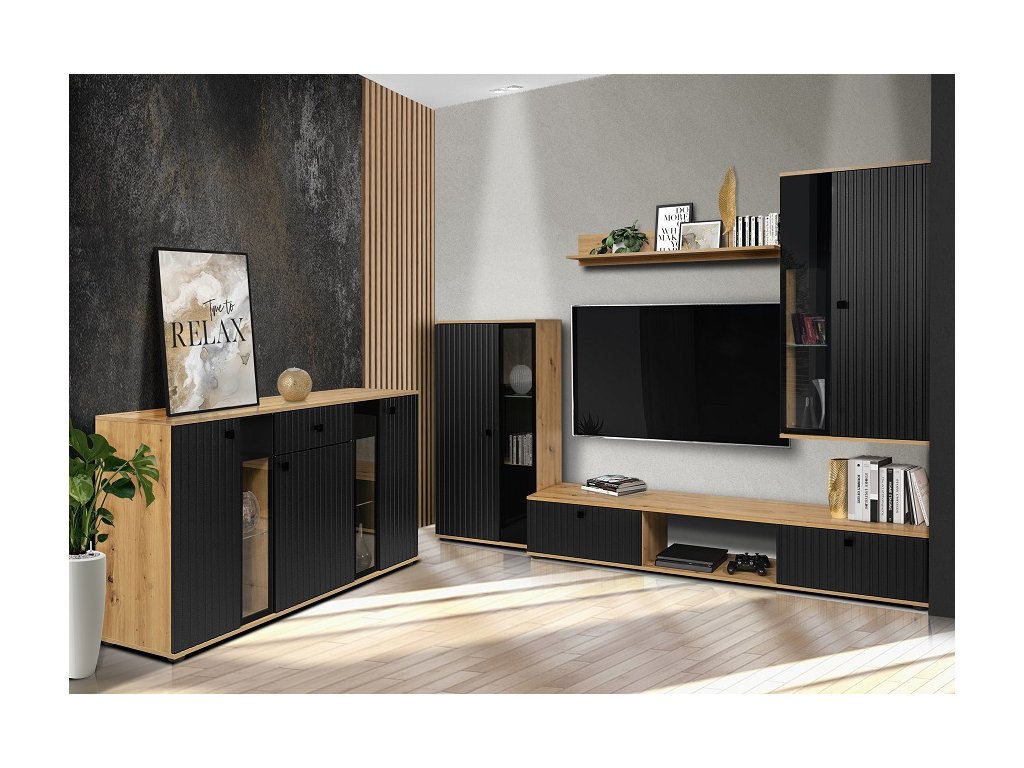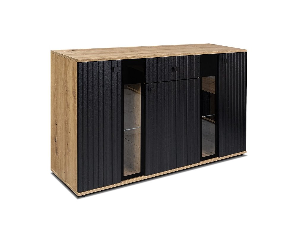 Komoda v moderním stylu. Komoda je částečně prosklená, má 3 dvířka a 1 praktickou zásuvku. Barevné provedení černá/dub artisan. Tato komoda krásně doplní obývací stěnu, kterou rovněž najdete v naší nabídce. Nábytek je vyroben z kvalitního lamina. Přední část komody je vyrobena z kvalitní MDF desky tloušťky 16 mm. Korpus je z LTD desky, tloušťka 15 mm. Sklo ve vitríně je čiré. Dodáváme v demontovaném stavu.Doplňkové parametry