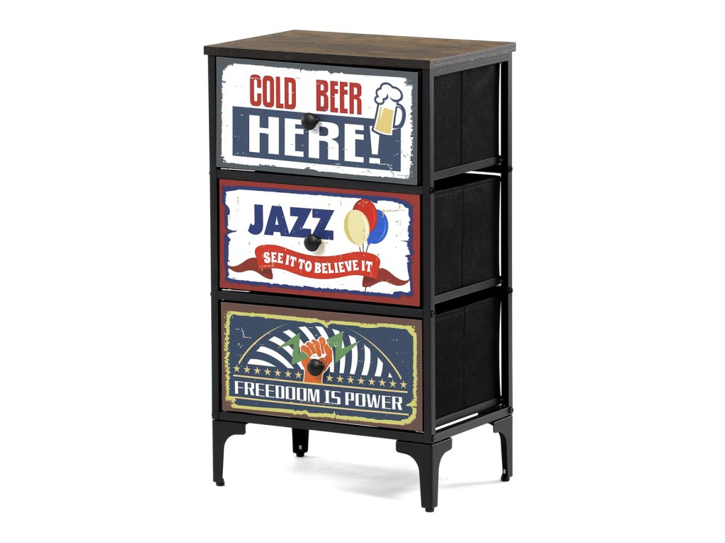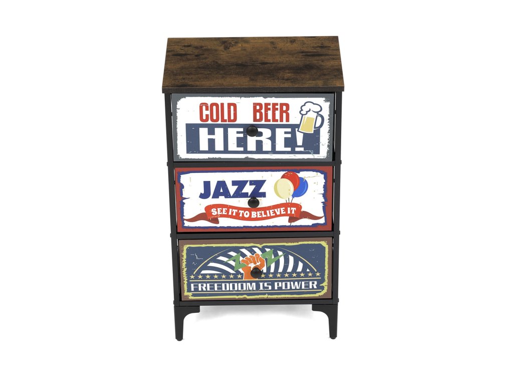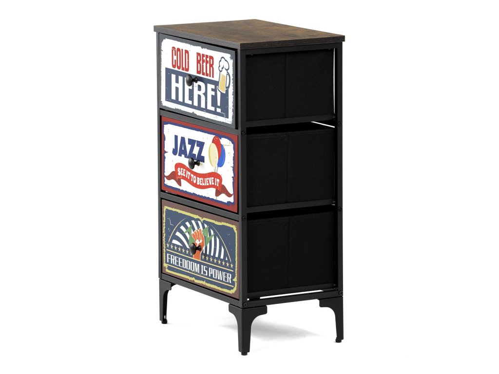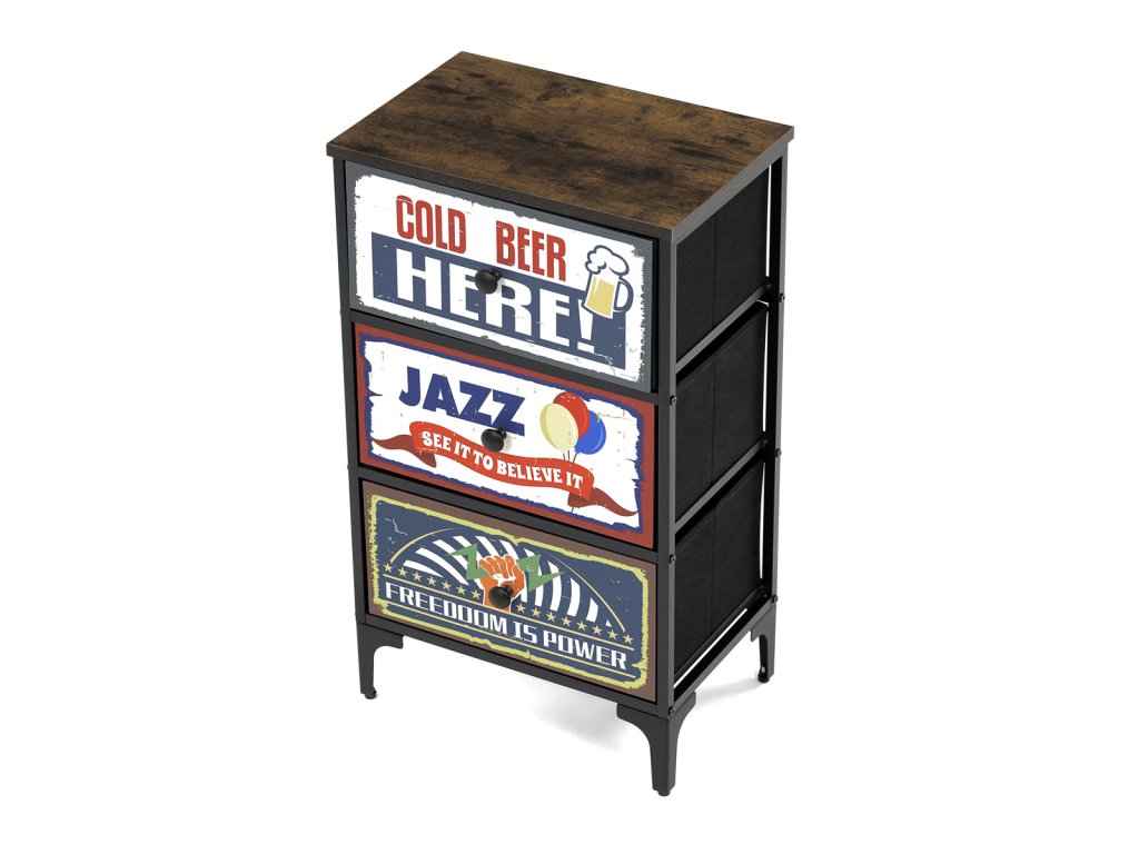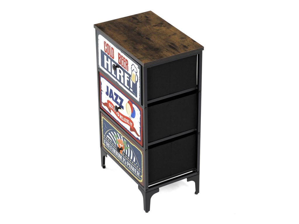 Retro komoda značky Autronic přinese do vašeho interiéru jedinečný styl a originalitu. Textilní čela zásuvek s výplní HDF a vintage potiskem navozují atmosféru starých amerických barů a jazzových klubů. Kombinace černé kovové konstrukce, desky v dekoru starého dřeva a zdobných noh dodává nábytku robustní, ale zároveň elegantní vzhled. Korpus zásuvek je vyroben z netkané textilie s výplní HDF, což zajišťuje jejich lehkost a snadnou manipulaci. Ideální doplněk do obývacího pokoje nebo stylové kavárny, kde se stane nepřehlédnutelným prvkem.Doplňkové parametry