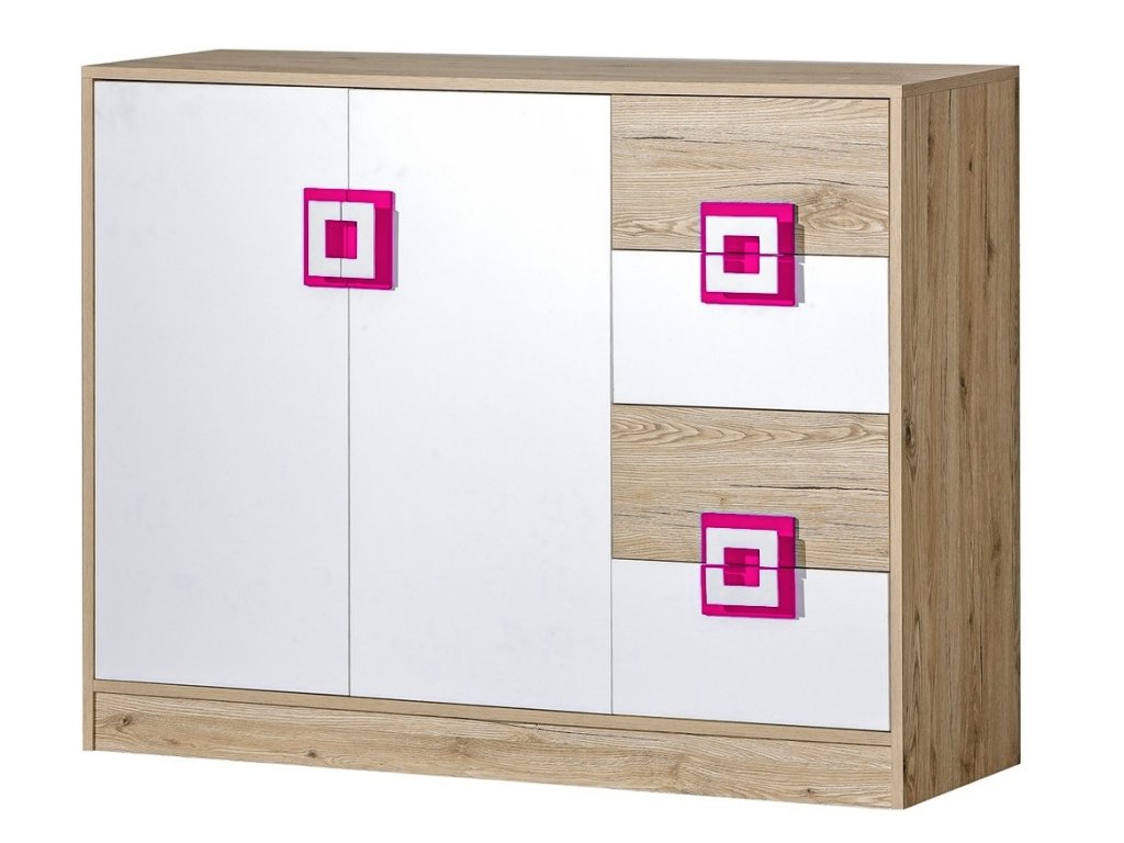 Komoda široká NIKO ze sektorové řady, která se vyznačuje netradičním zpracováním barev a originalitou úchytů. Tento styl nábytku zaujme každou mladší generaci. Komoda je vyrobena z kvalitní LTD desky hraněné ABS lištou. Korpus je v barvě dub jasný, dveře jsou v kombinaci barev bílá mat / dub jasný. Úchytky jsou v barevné kombinaci růžová / bílá. Uvnitř komody je police a 4 zásuvky v pravé části. Sektorový nábytek NIKO má široký výběr prvků, který Vám zaručí sestavit si dětský nebo studentský pokoj, ložnici či kancelář podle svých potřeb, přání a představ. Dodáváme v demontovaném stavu.Doplňkové parametry