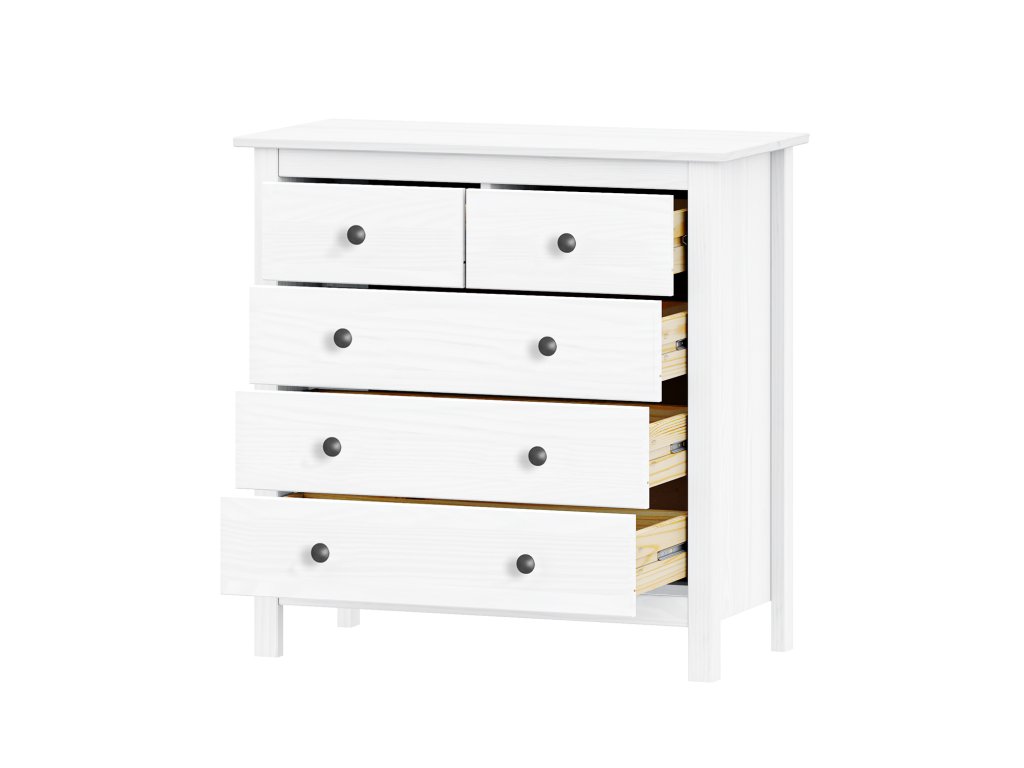 materiál masiv borovice, barevné provedení bílý lak kovové úchytky v barevném provedení černěná mosaz 2 menší a 3 větší zásuvky s kovovými pojezdyDoplňkové parametry