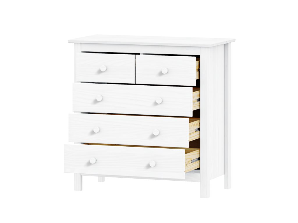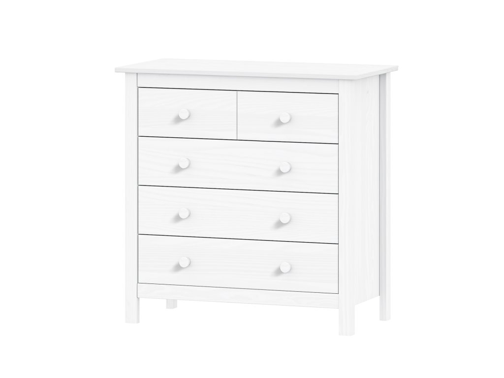 materiál masiv borovice, barevné provedení bílý lak 2 menší a 3 větší zásuvky s kovovými pojezdyDoplňkové parametry