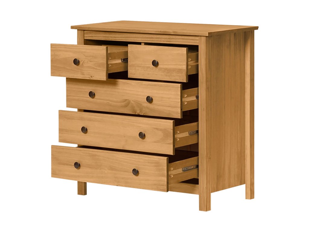 materiál masiv borovice voskovaná v medovém odstínu kovové úchytky v barevném provedení černěná mosaz 2 menší a 3 větší zásuvky s kovovými pojezdyDoplňkové parametry