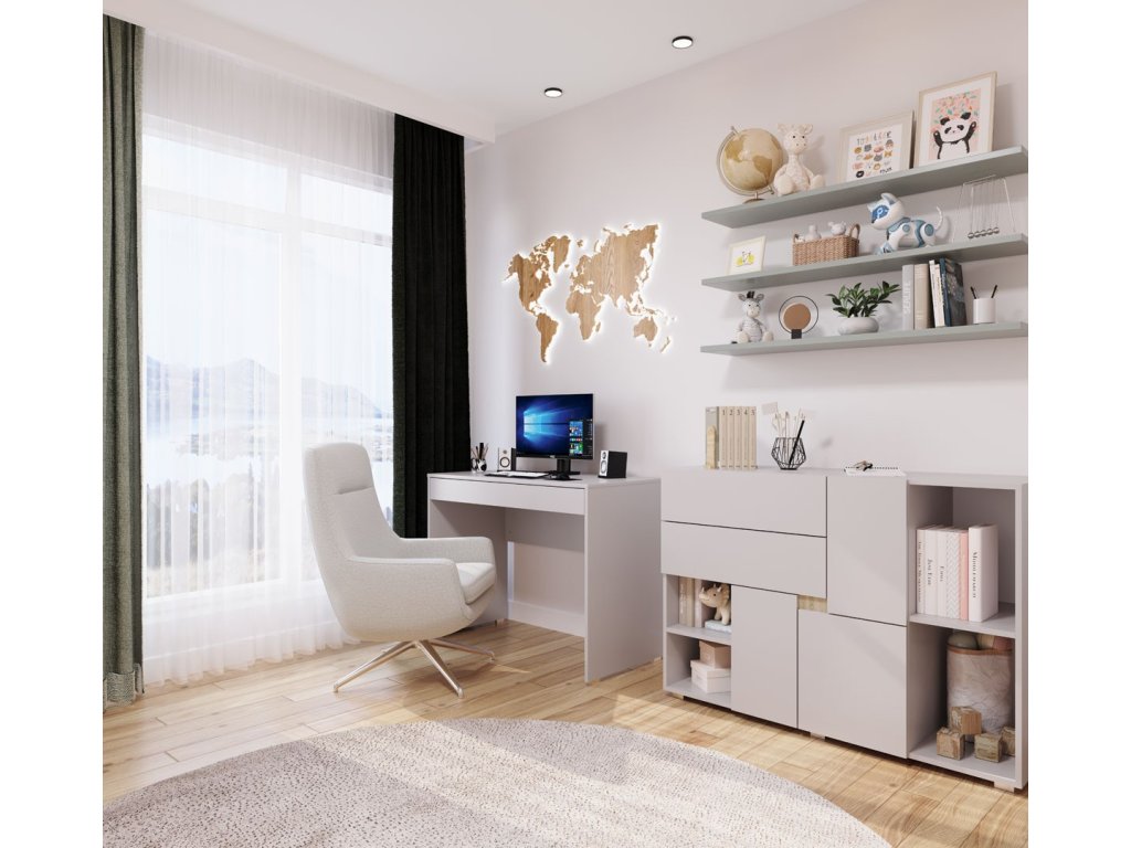 Díky široké nabídce prvků – komody, policová a šatní skříň, psací stůl, jednolůžková postel a noční stolek – si můžete vytvořit dokonalou sestavu do dětského nebo studentského pokoje podle vlastních představ.