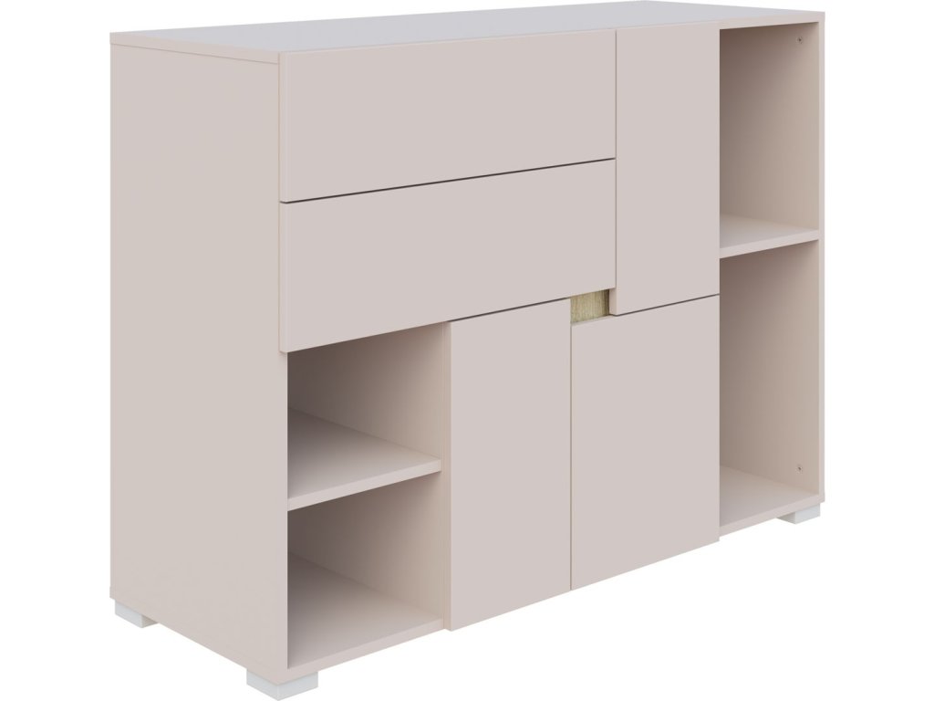 Praktická široká komoda je ideálním doplňkem do dětského nebo studentského pokoje. Komoda obsahuje praktické otevřené police, troje dvířka a 2 zásuvky. Uvnitř se nachází 1 police, která poskytuje dostatek prostoru pro oblečení, hračky či školní potřeby. Komoda je vyrobena z kvalitní LTD desky o tloušťce 16 mm a zaujme moderním provedením kašmír s detaily v dekoru dub Sonoma.