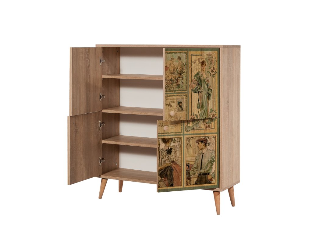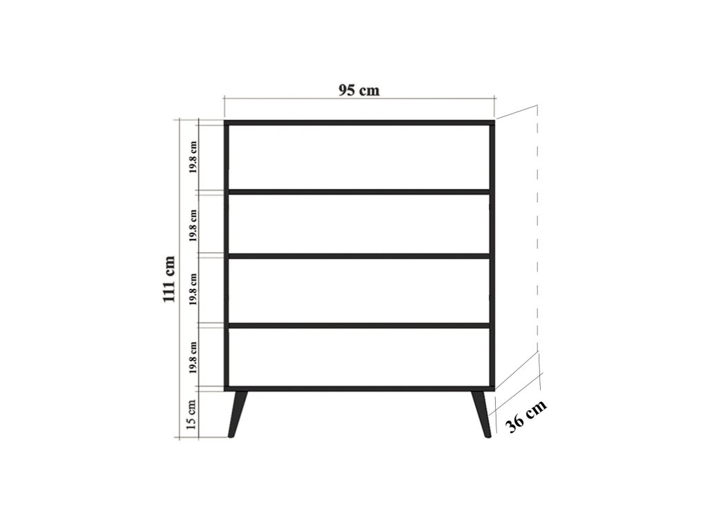 Tato skříňka je vyrobena ze 100% dřevotřísky s melaminovým povlakem a je konstruována tak, aby vydržela. Tloušťka 18 mm zajišťuje odolnost a robustnost, zatímco UV povlak ji chrání před poškrábáním a vyblednutím. Habrové nohy zajišťují stabilitu a kovové a lanové úchyty dodávají nádech elegance.