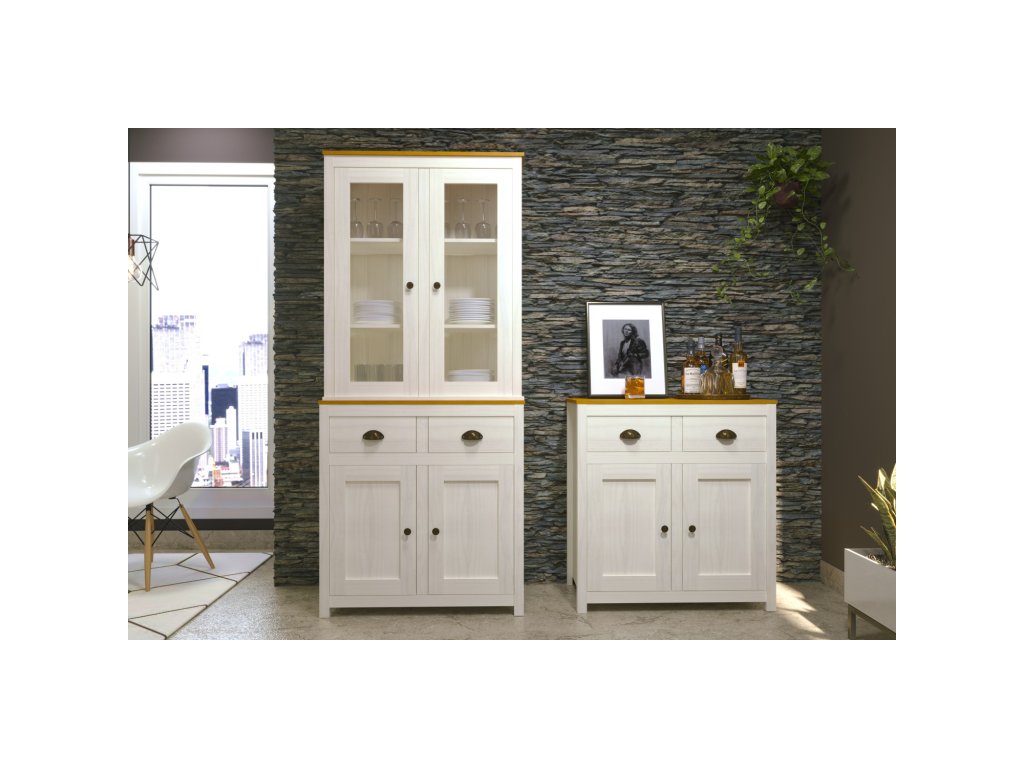 materiál masiv borovice, barevné provedení bílý / hnědý lak dvě zásuvky s kovovými úchytkami a pojezdy dvoje plné a dvoje prosklené dveřeDoplňkové parametry