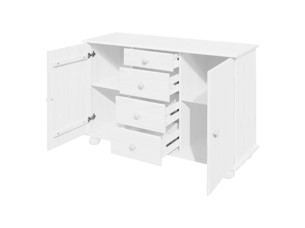 sestava příborníku 8045B a nástavce 8046B materiál masiv borovice, barevné provedení bílý lak příborník: 4 zásuvky s kovovými pojezdy, 2 skříňky s dvířky vybavené policí nástavec: 2 prosklená dvířka rozměr příborníku (š/h/v) 119 × 38 × 81 cm rozměr nástavce (š/h/v) 119 × 30 × 108 cmDoplňkové parametry