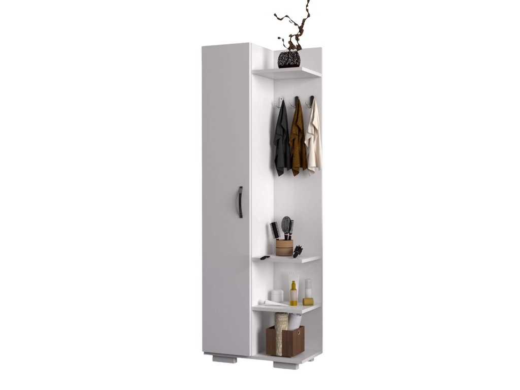 Skříňka je dodávána v demontovaném stavu s přiloženým návodem na snadnou montáž. Její čistý bílý design a praktické prvky, jako jsou regálky a věšáky, ji činí univerzálním doplňkem, který se hodí do každého moderního interiéru. Tato skříňka je perfektní volbou pro každého, kdo hledá stylové a funkční úložné řešení.