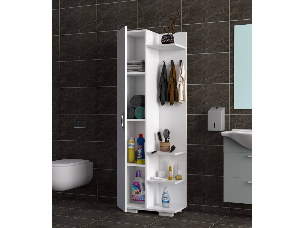 Skříňka přináší do vašeho domova dokonalou kombinaci funkčnosti a skandinávského stylu. Vysoká skříňka s regálkem a věšáky je navržena tak, aby efektivně využívala prostor a poskytovala dostatek úložného místa pro různé potřeby v koupelně, obývacím pokoji nebo kuchyni.