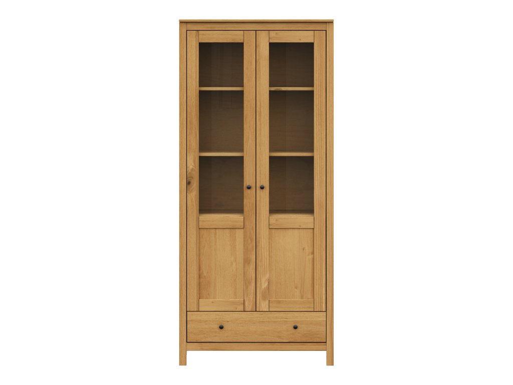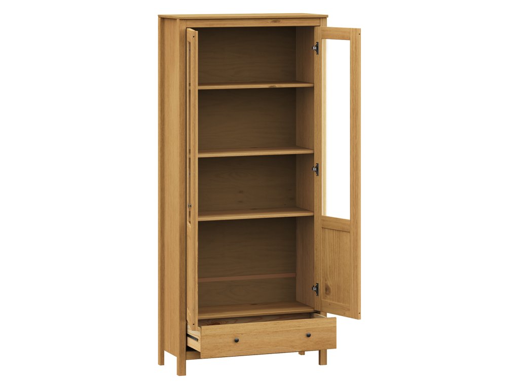 materiál masiv borovice voskovaná v medovém odstínu kovové úchytky v barevném provedení černěná mosaz dvoje částečně prosklené dveře, tři police jedna zásuvka s kovovými pojezdyDoplňkové parametry