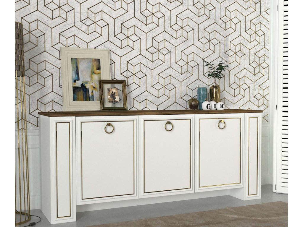 Komoda je vyrobena z kvalitního LTD materiálu s tloušťkou 18 mm, což zajišťuje její pevnost a dlouhou životnost. Elegantní kombinace bílé barvy a ořechového dekoru dodává komodě moderní a sofistikovaný vzhled, který se hodí do jakéhokoliv interiéru. Komoda je vybavena třemi dvířky, které poskytují dostatek úložného prostoru pro vaše potřeby.