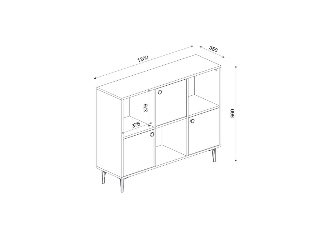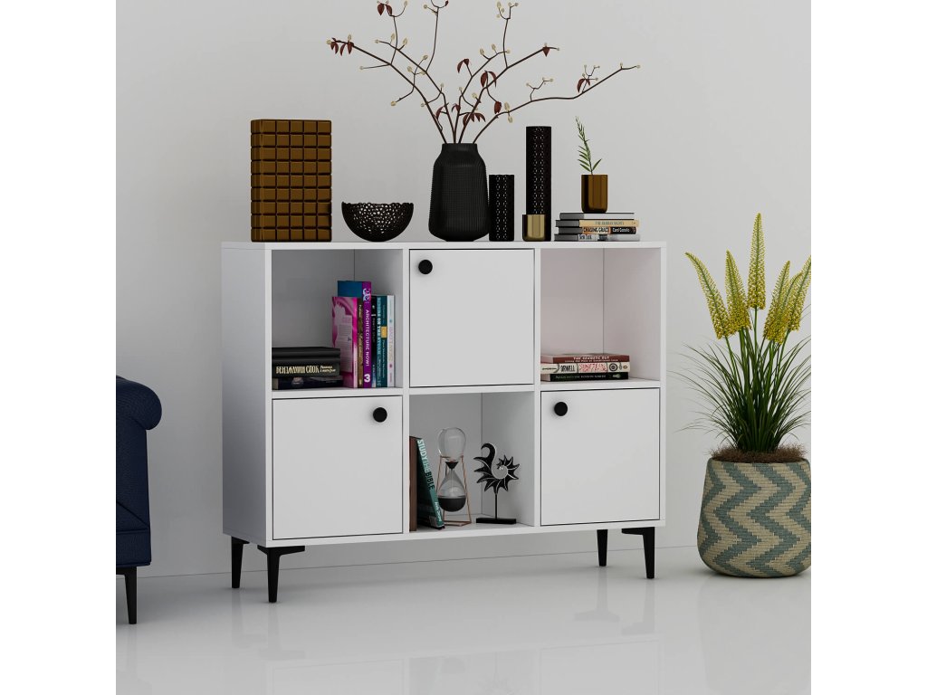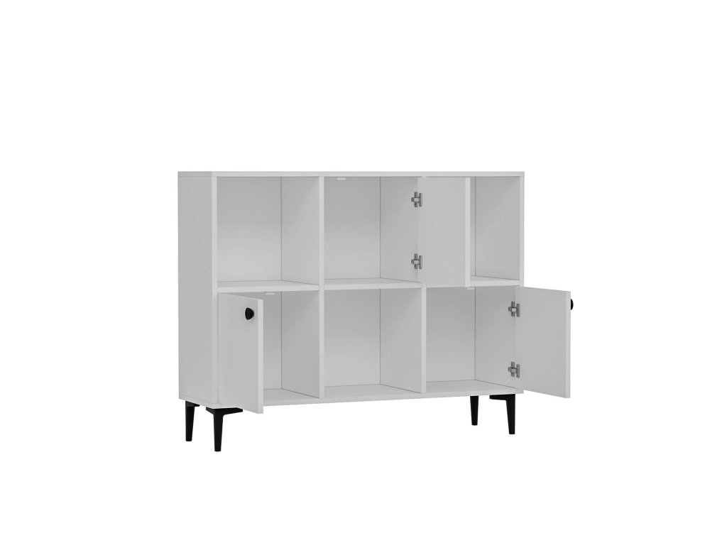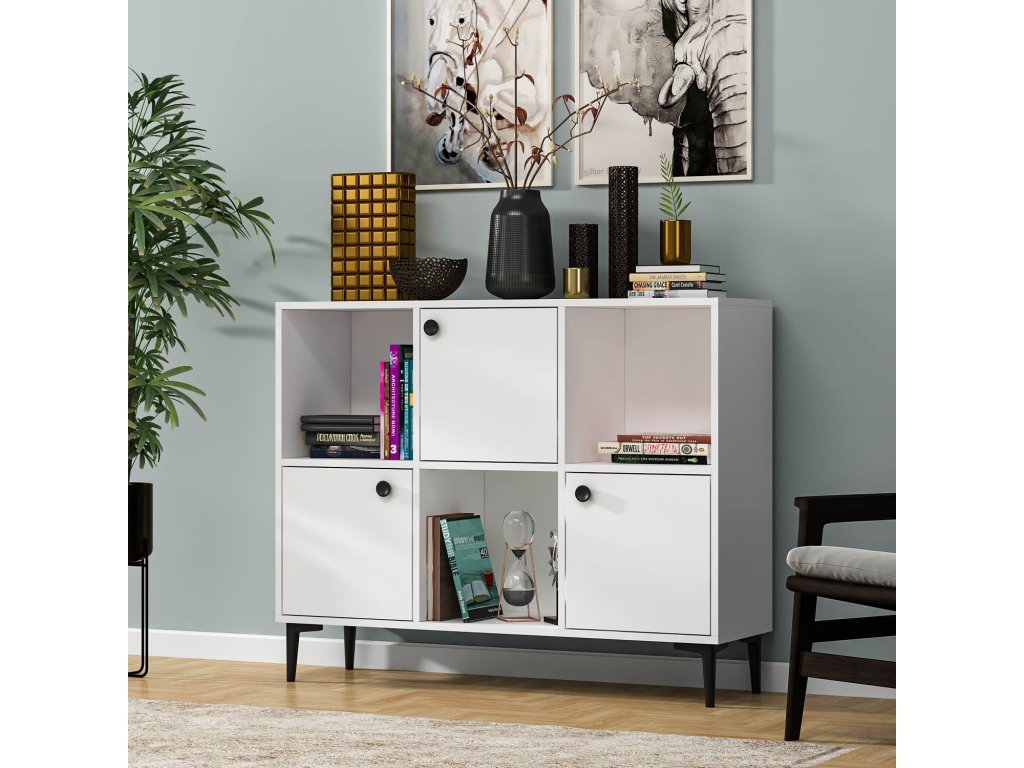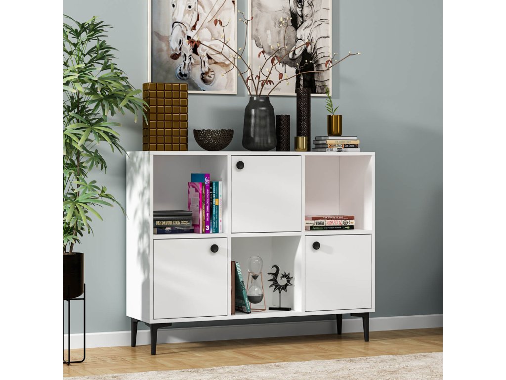 Skříňka je navržena pro ty, kteří hledají funkční a elegantní úložné řešení do svého obývacího pokoje. Její široký design s kombinací plných dvířek a regálku poskytuje dostatek prostoru pro uspořádání knih, dekorací či dalších předmětů, které chcete mít po ruce.