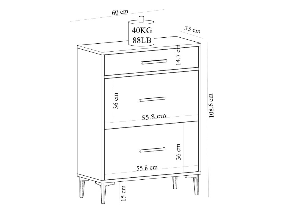 S rozměry 108.6 x 60 x 35 cm skříňka nabízí kompaktní, ale efektivní úložné řešení. Vyrobena z kvalitního LTD materiálu o tloušťce 18 mm, zajišťuje dlouhou životnost a stabilitu. Plastové úchytky a plastové nožičky dodávají moderní vzhled a snadné používání.