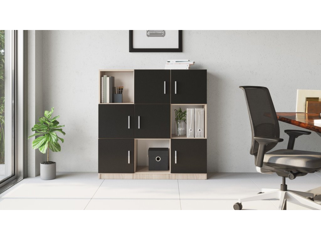 Stylový design: komoda/skříňka zhotovená z kvalitního materiálu LTD, který kombinuje přírodní dub a moderní černou barvu. Tato kombinace dodává sofistikovaný a elegantní vzhled, který se hodí do jakéhokoli pracovního prostředí.