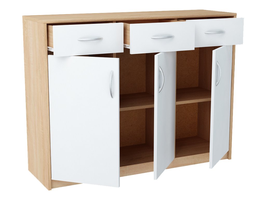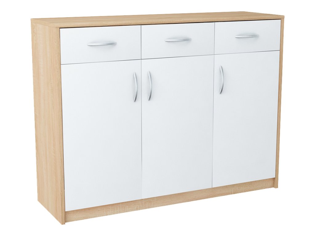 Třídveřová komoda se 3 zásuvkami v moderním provedení. Korpus i dvířka jsou z kvalitní LTD, korpus v barvě dub sonoma a dvířka v barvě bílá. Lamino je odolné vůči vysokým teplotám, poškrábání a nárazům, hraněné ABS páskou. Jasně viditelná struktura dřeva. Pojezdy v zásuvkách jsou kovové s plastovými kolečky. Dodáváme v demontovaném stavu.Doplňkové parametry