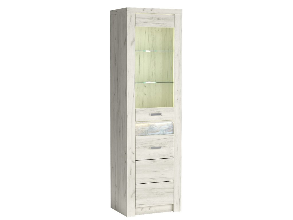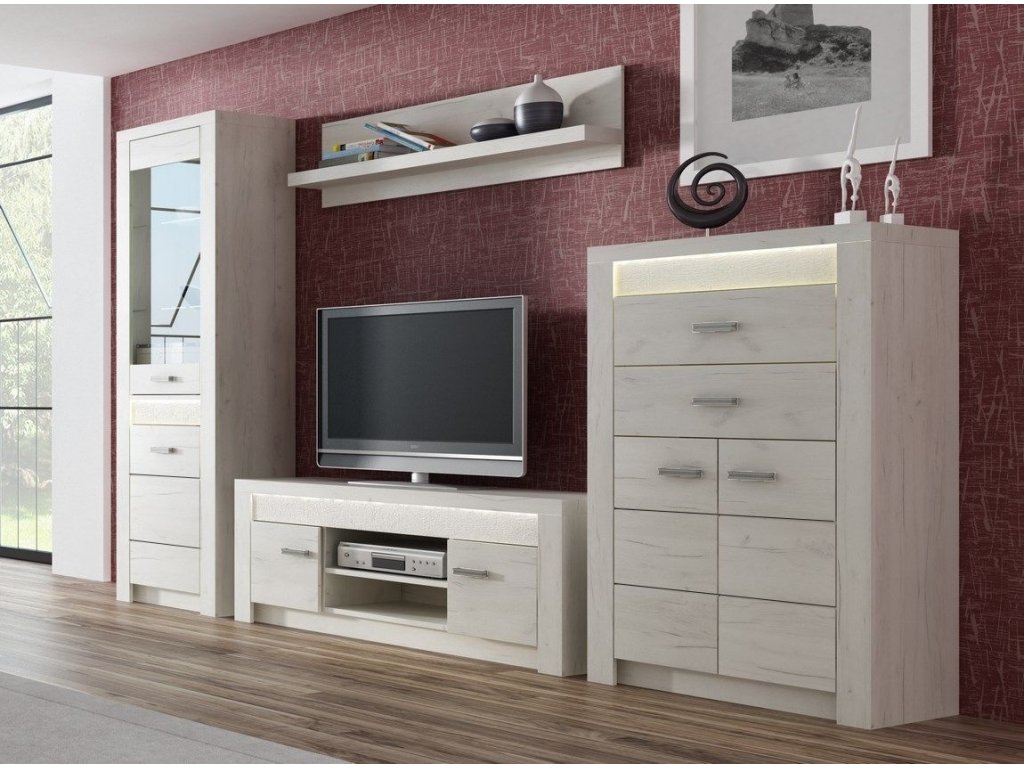 Obývací sestava. Tento systém je exkluzivní kolekce navržena v moderním duchu. Celá řada se vyznačuje elegancí a jednoduchými tvary, které zaručují plné využití prostoru. Nábytek je vyroben z kvalitního lamina s ABS hrany ( 0,5-0,8 mm ), úchyty jsou z kovu. Barevné provedení je jasan bílý indiana. Sestava se skládá ( šxhxv ) - vitrína ( 56 x 42 x 192 cm ), komoda ( 76 x 42 x 127 cm ), tv stolek ( 137 x 42 x 53 cm ) a police ( 120 x 18 x 32 cm ). Nábytek neobsahuje LED osvětlení v ceně, možnost dokoupení. V naší nabídce naleznete další sortiment z řady. Dodáváme v demontovaném stavu.Doplňkové parametry
