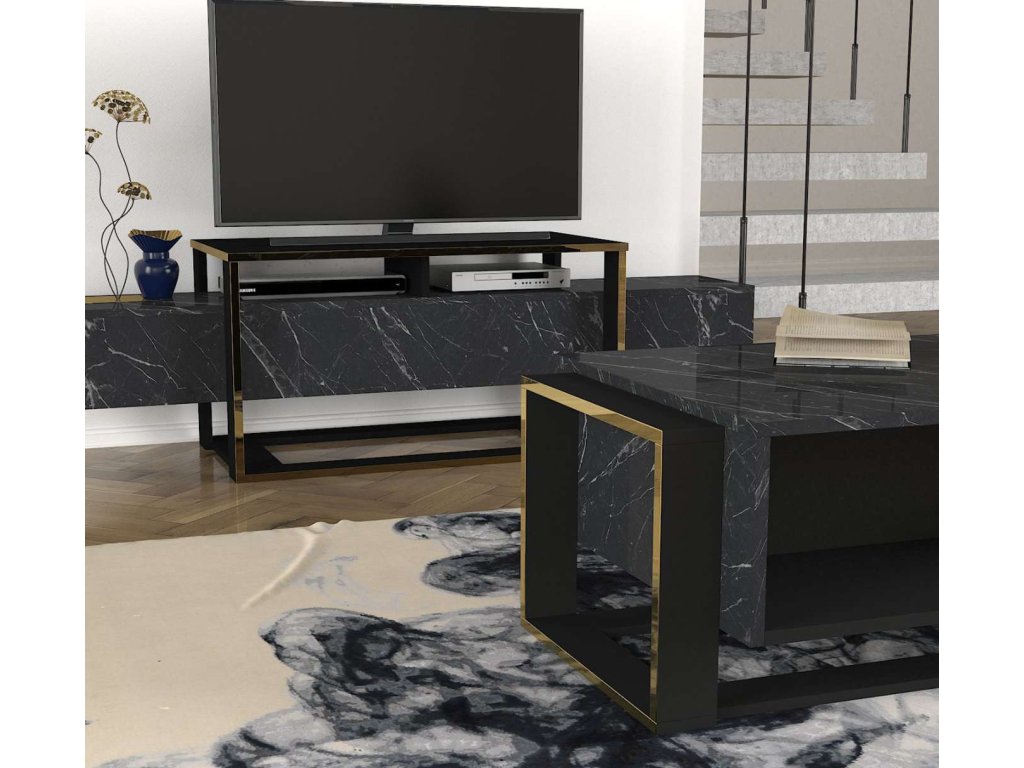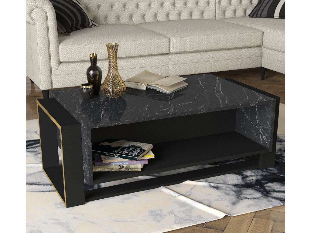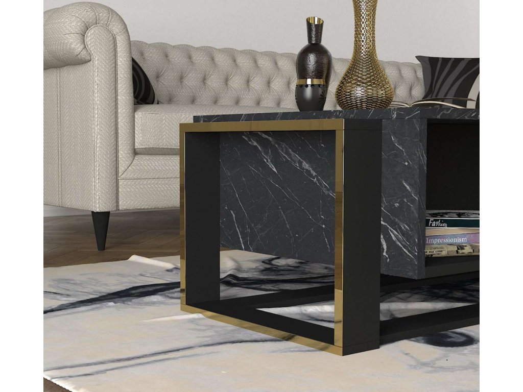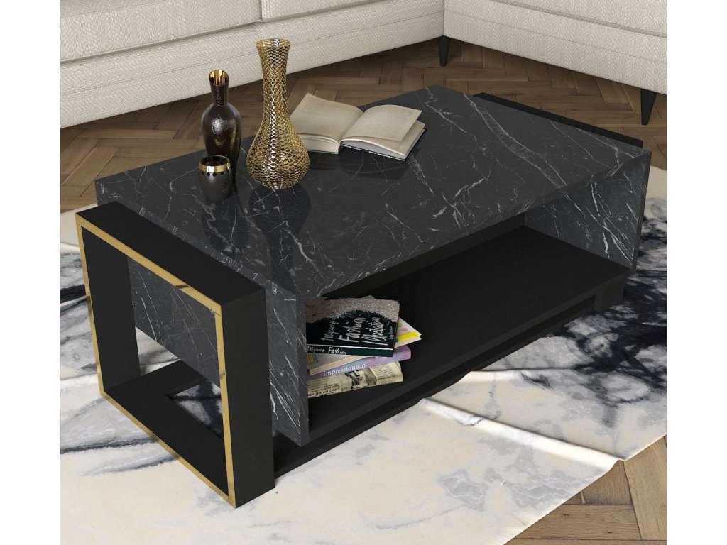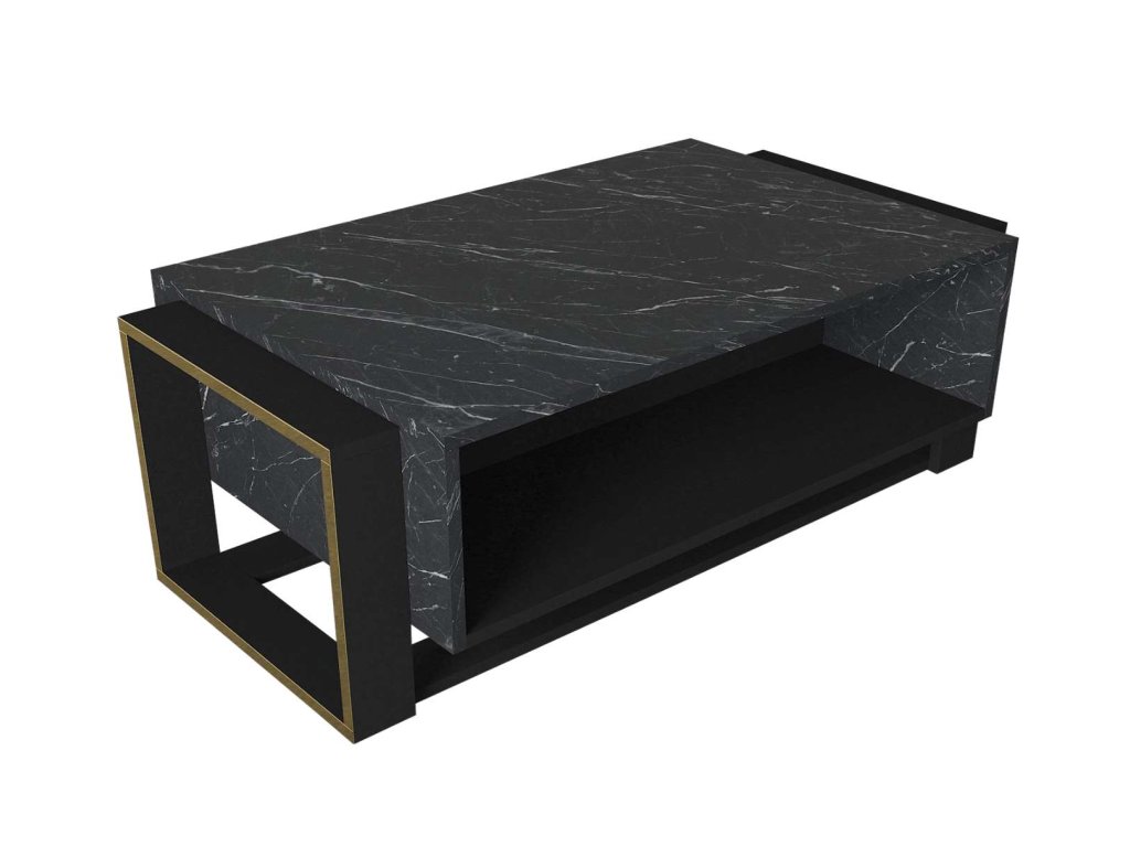 Konferenční stolek je ideální volbou pro ty, kteří hledají moderní a funkční nábytek s luxusním vzhledem. Jeho kombinace černé a mramorové barvy a minimalistický design přinášejí do vašeho domova svěžest a moderní styl, zatímco poskytují dostatek úložného prostoru pro všechny vaše potřeby.