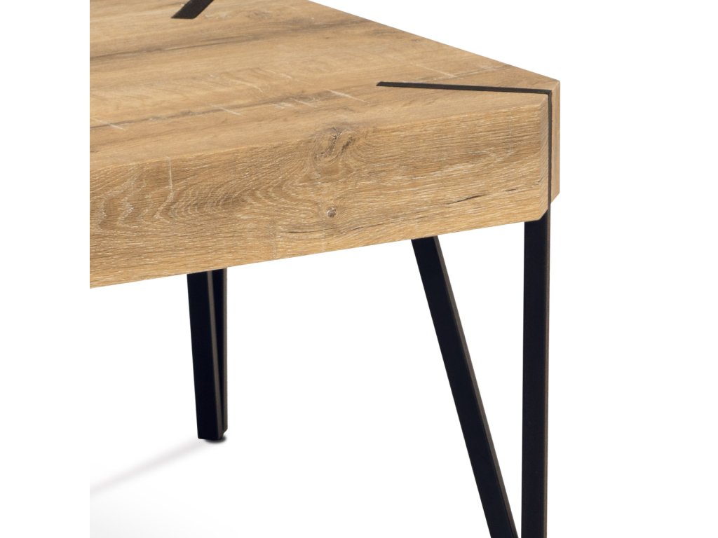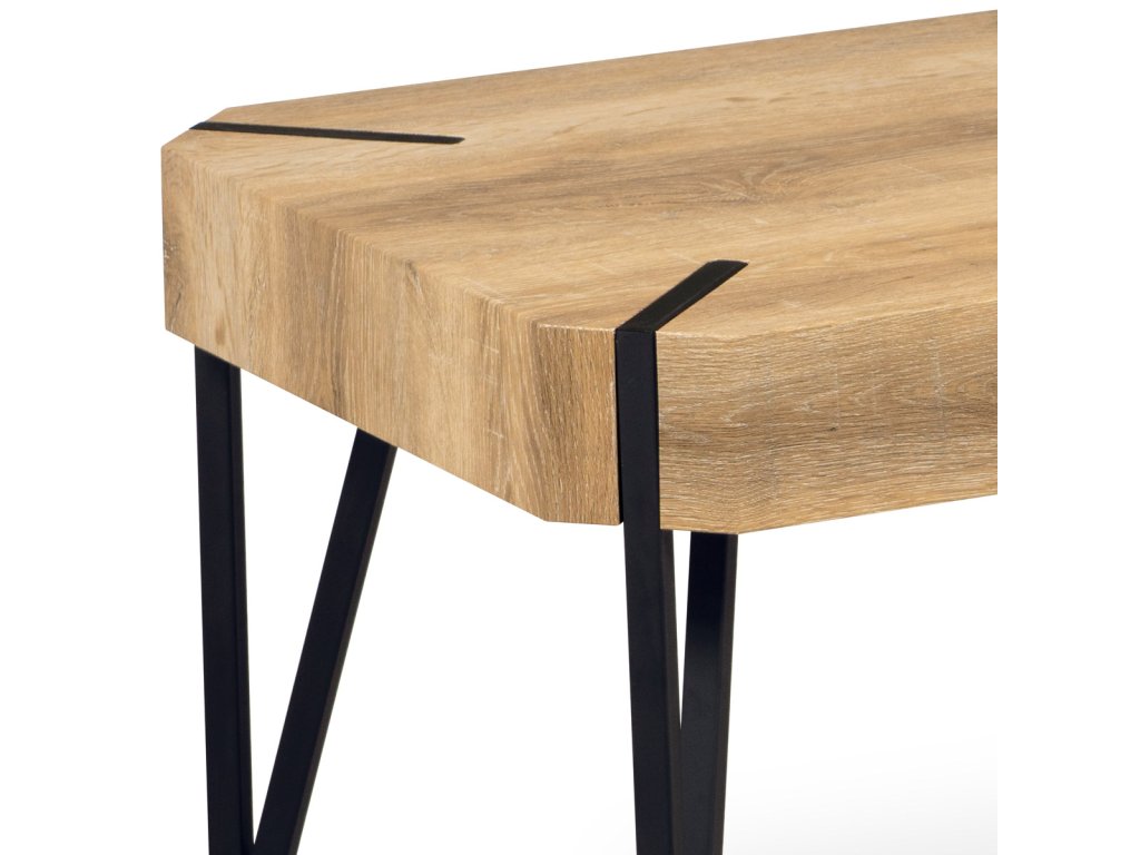 Konferenční stolek o rozměrech 110x60x42 cm kombinuje desku z MDF s běleným dubovým dekorem a pevné kovové nohy v matné černé barvě, které zajišťují stabilitu a dlouhou životnost. Deska s přírodním dubovým dekorem nabízí odolný povrch, který se snadno udržuje a je vhodný pro každodenní použití v moderních interiérech. Kovové nohy mají jednoduchý geometrický tvar, který podtrhuje industriální charakter stolku a zároveň poskytuje dostatečnou nosnost. Design spojuje přírodní vzhled dřeva s moderním kovovým prvkem, což umožňuje stolek snadno začlenit do různých stylů zařízení. Stolek je pevný a navržený tak, aby sloužil jako praktický doplněk obývacího pokoje nebo kanceláře.Doplňkové parametry