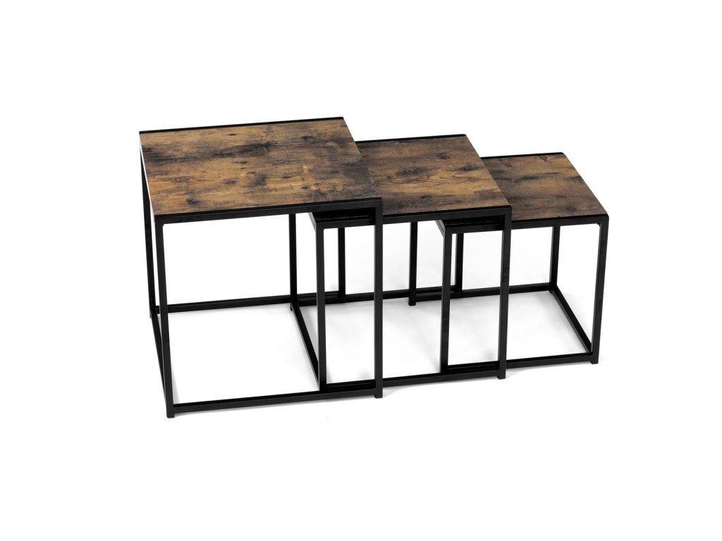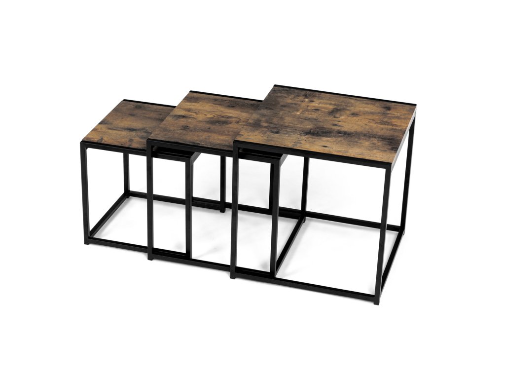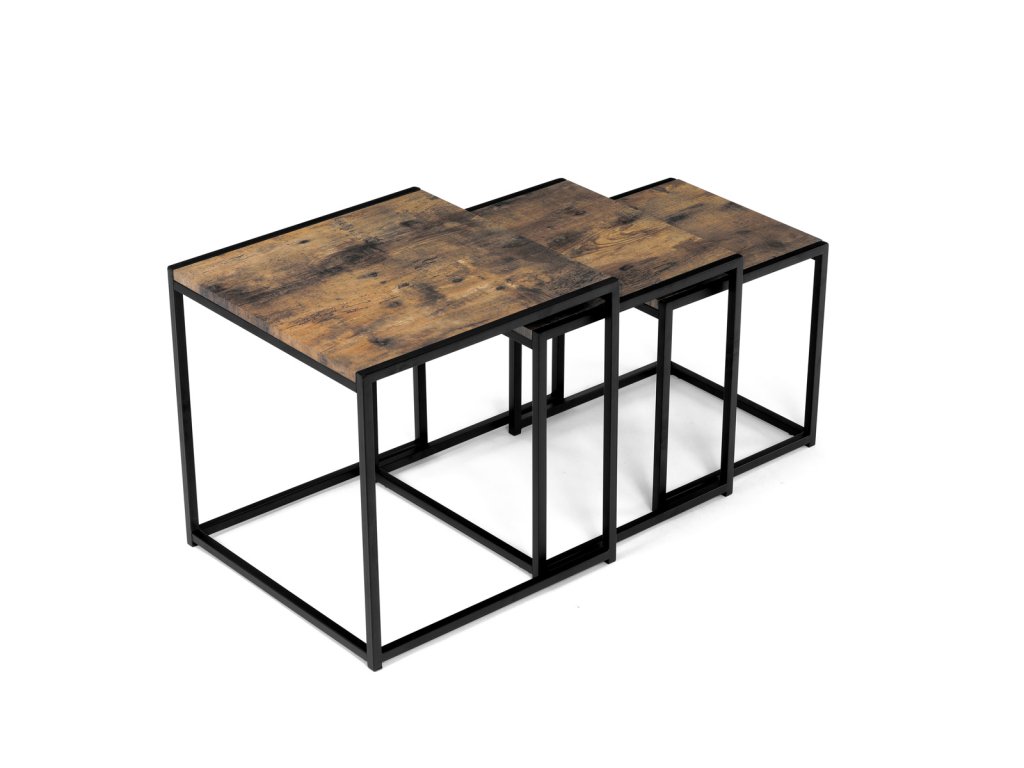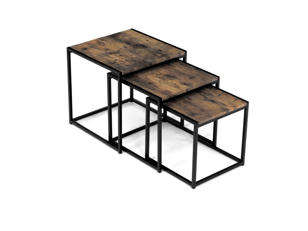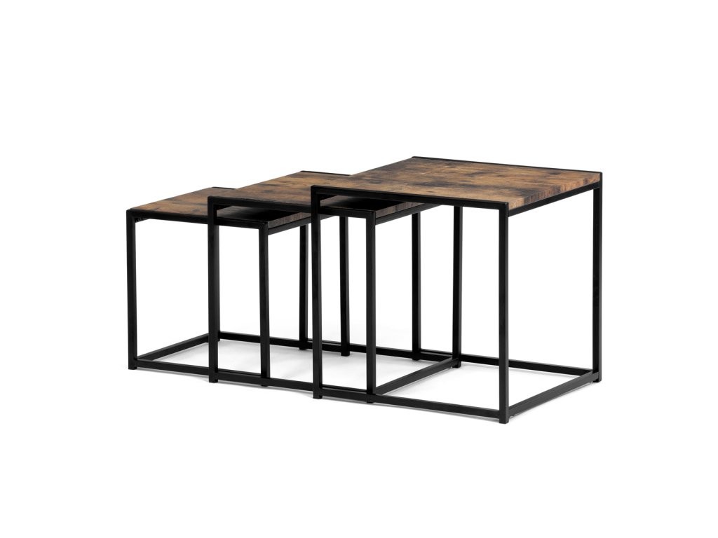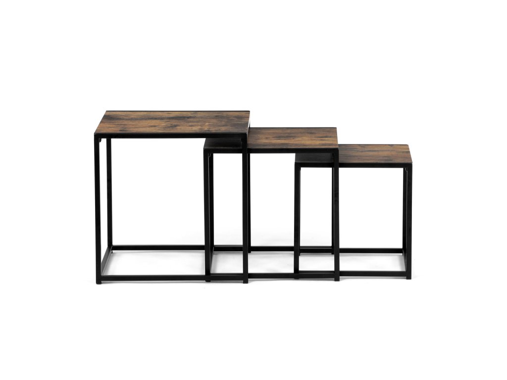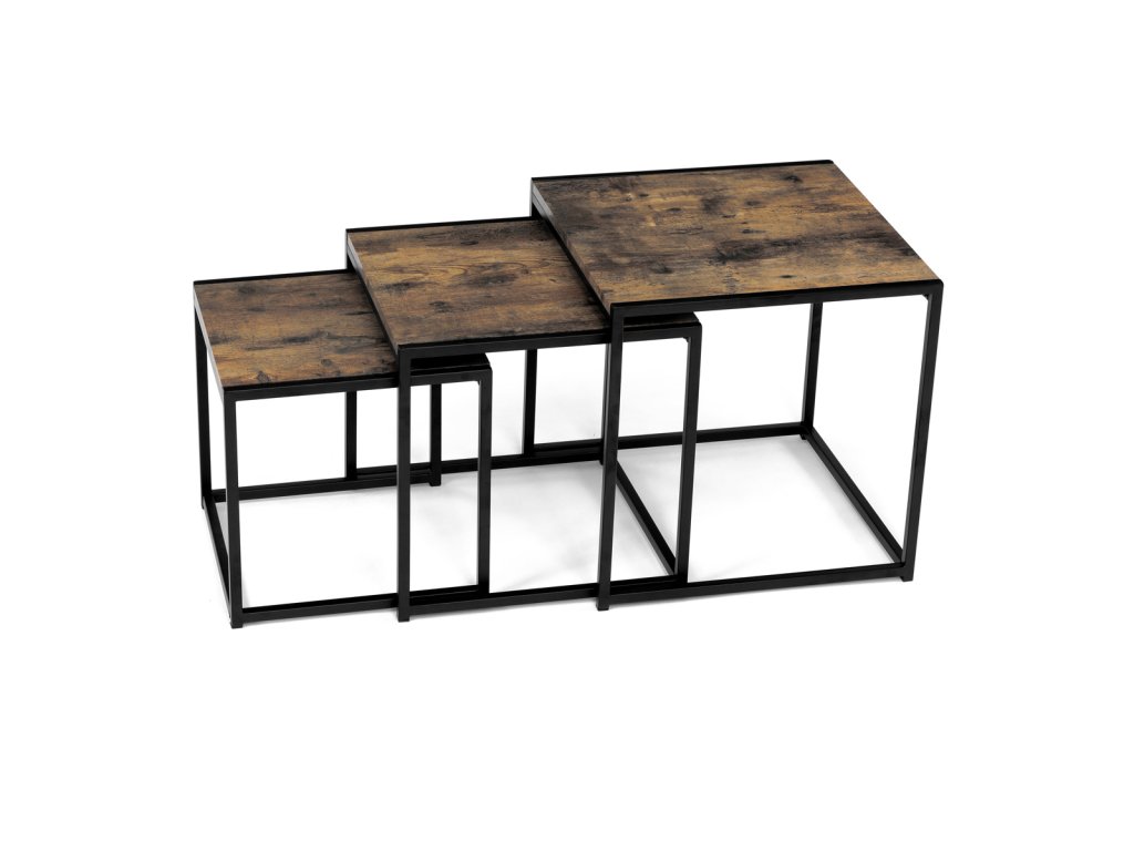 Set 3 ks přístavných nebo odkládacích stolků přinese do Vašeho domova praktičnost, variabilitu, ale také industriální šarm. Stolky můžete rozmístit jednotlivě po interiéru, kde Vám vytvoří zajímavé odkládací prvky v různých výškových hladinách. A nebo společně povytažené, kde vytvoříte velkou obdélníkovou stupňovitou odkládací plochu. Velkou výhodou je možnost zasunutí stolků do sebe, což oceníte při úklidu, skladování nebo při potřebě většího prostoru. Čtvercové desky z MDF v dekoru staré dřevo harmonicky doplňují černá kovová konstrukce, která tvoří rovněž nohy a celkově stolky zpevňuje. Stolek jistě zaujmou nejen svým nadčasovým designem, ale i variabilitou a praktičností. Desky májí rozměr 35 x 35 x 35 , 40 x 40 x 40 a 45 x 45 x 45 cm, tloušťku 1,5 cm. Konstrukce je čtvercového průřezu, na spodních plochách opatřená plastovými kluzáky. Nosnost jednotlivého stolku je do 15 kg.Doplňkové parametry