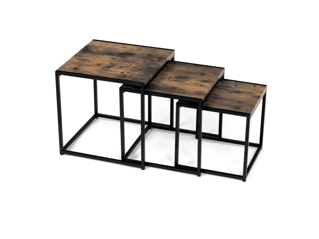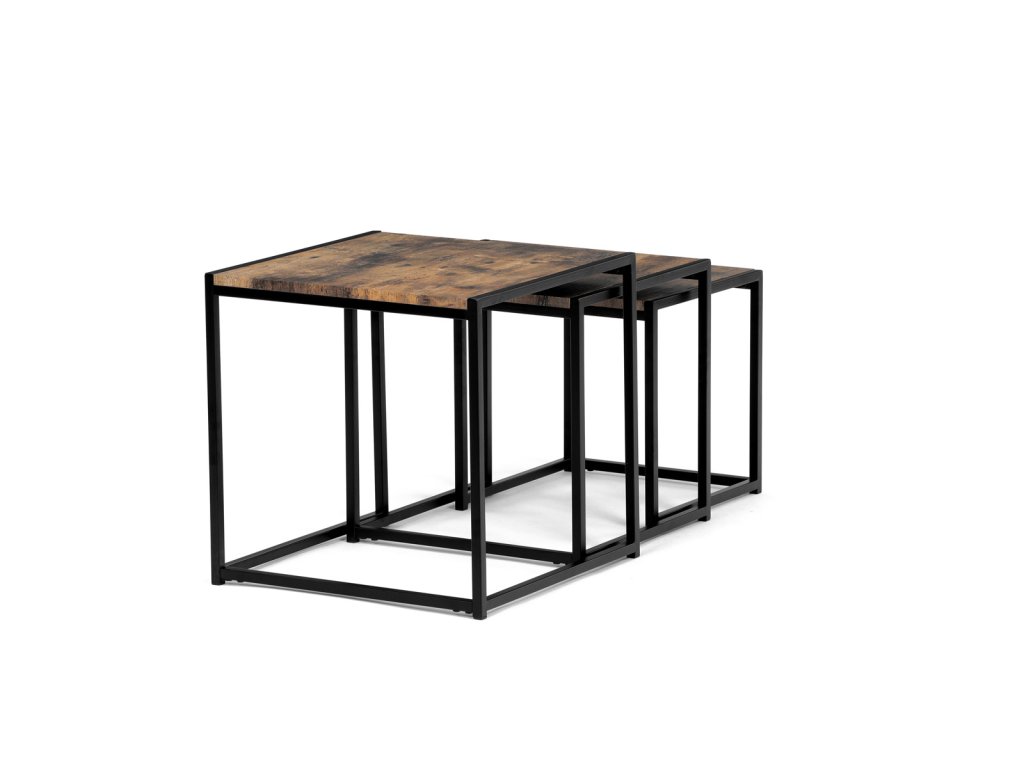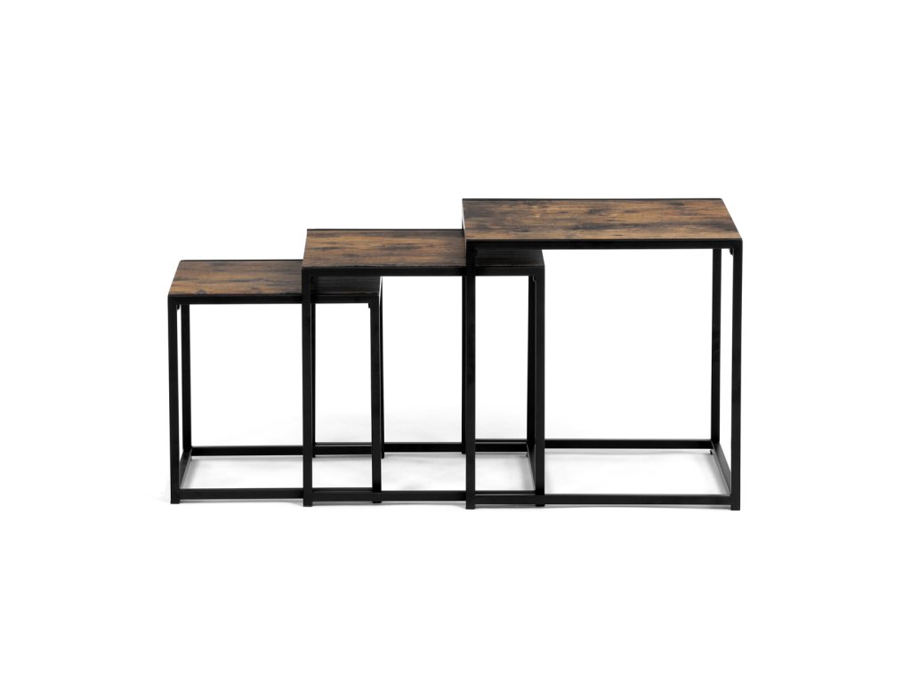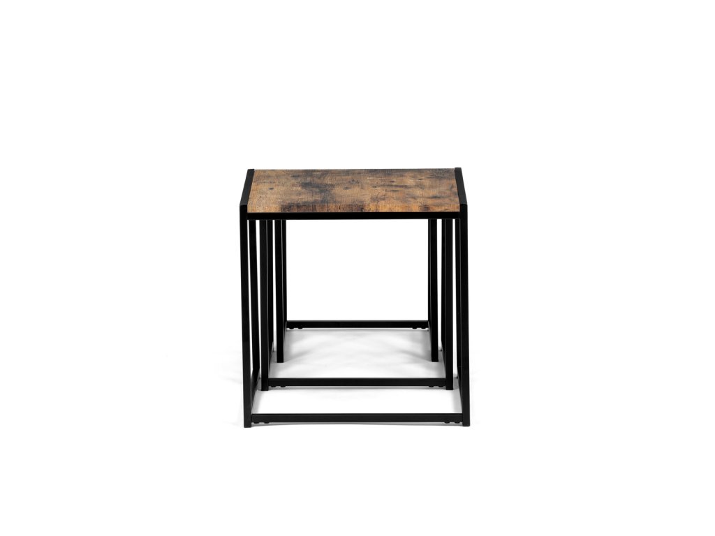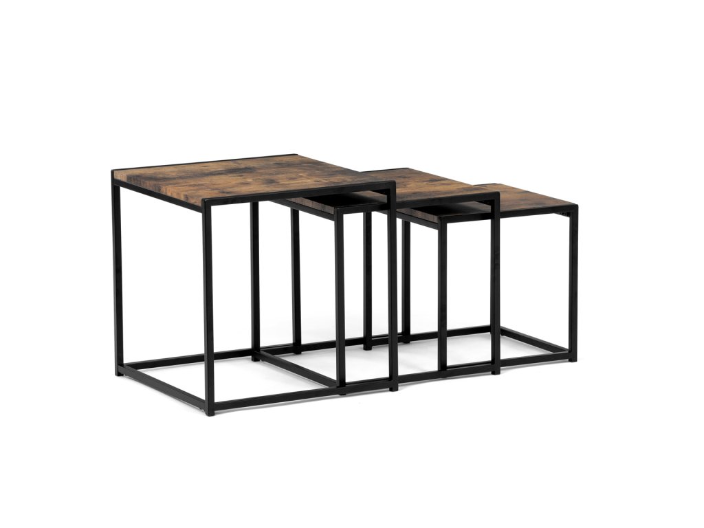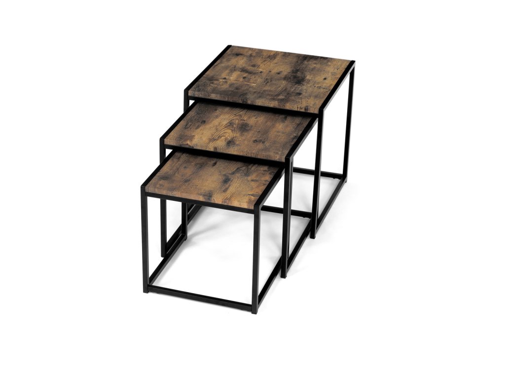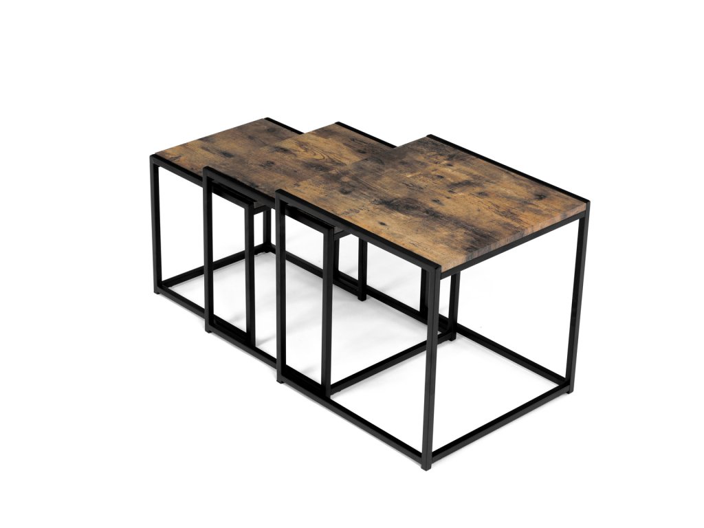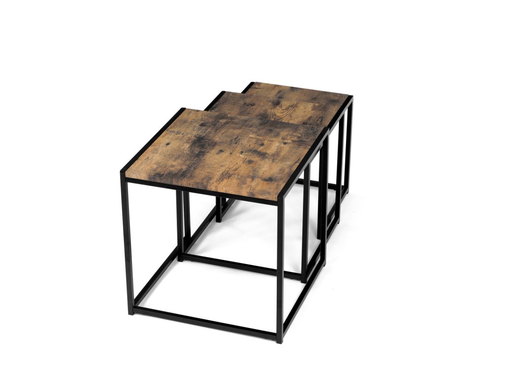 Set 3 ks přístavných nebo odkládacích stolků přinese do Vašeho domova praktičnost, variabilitu, ale také industriální šarm. Stolky můžete rozmístit jednotlivě po interiéru, kde Vám vytvoří zajímavé odkládací prvky v různých výškových hladinách. A nebo společně povytažené, kde vytvoříte velkou obdélníkovou stupňovitou odkládací plochu. Velkou výhodou je možnost zasunutí stolků do sebe, což oceníte při úklidu, skladování nebo při potřebě většího prostoru. Čtvercové desky z MDF v dekoru staré dřevo harmonicky doplňují černá kovová konstrukce, která tvoří rovněž nohy a celkově stolky zpevňuje. Stolek jistě zaujmou nejen svým nadčasovým designem, ale i variabilitou a praktičností. Desky májí rozměr 35 x 35 x 35 , 40 x 40 x 40 a 45 x 45 x 45 cm, tloušťku 1,5 cm. Konstrukce je čtvercového průřezu, na spodních plochách opatřená plastovými kluzáky. Nosnost jednotlivého stolku je do 15 kg.Doplňkové parametry