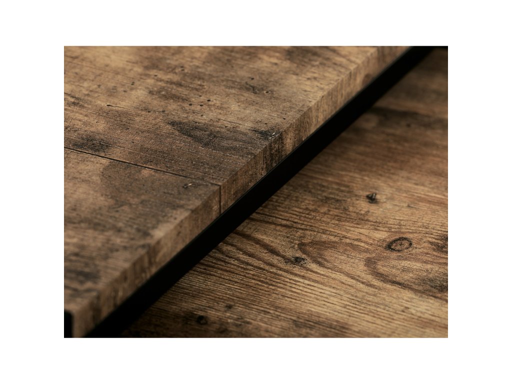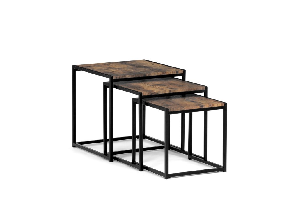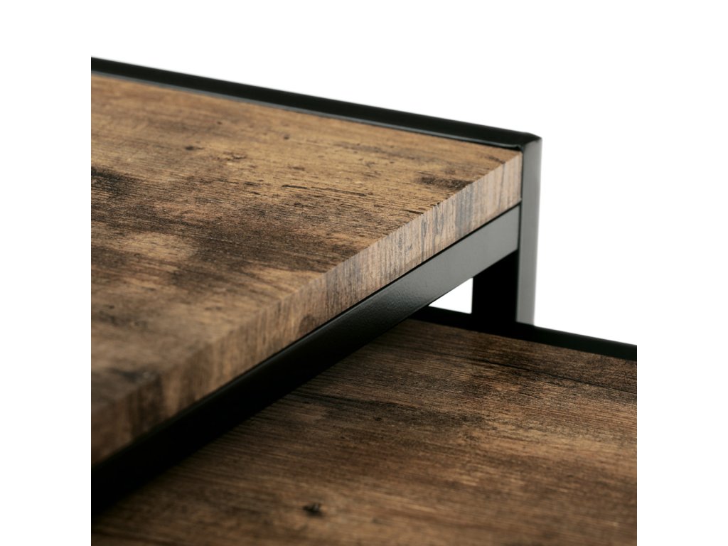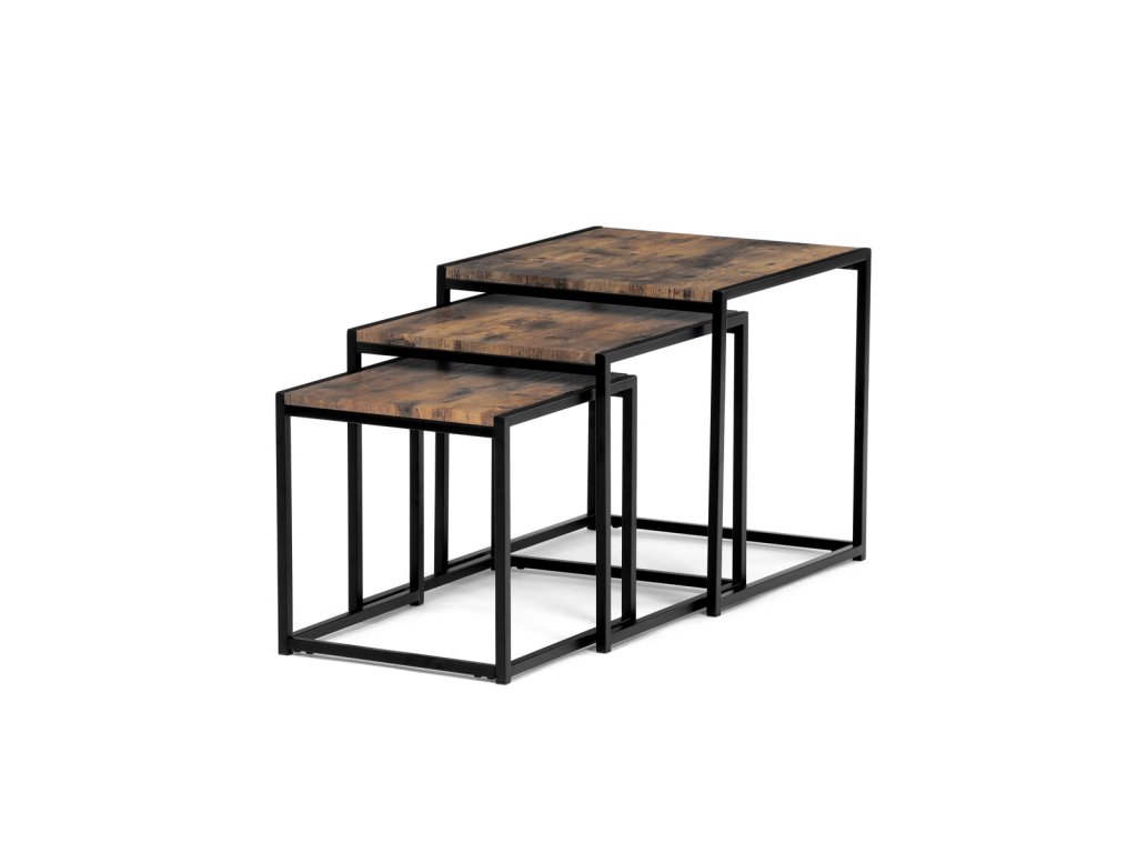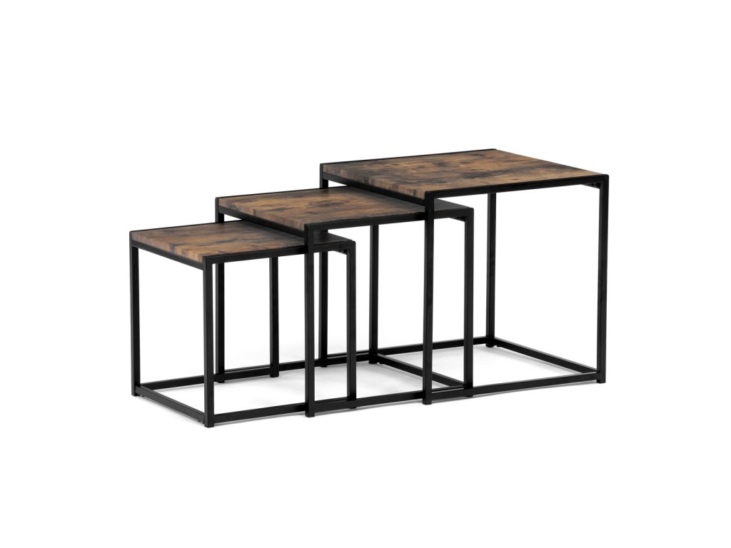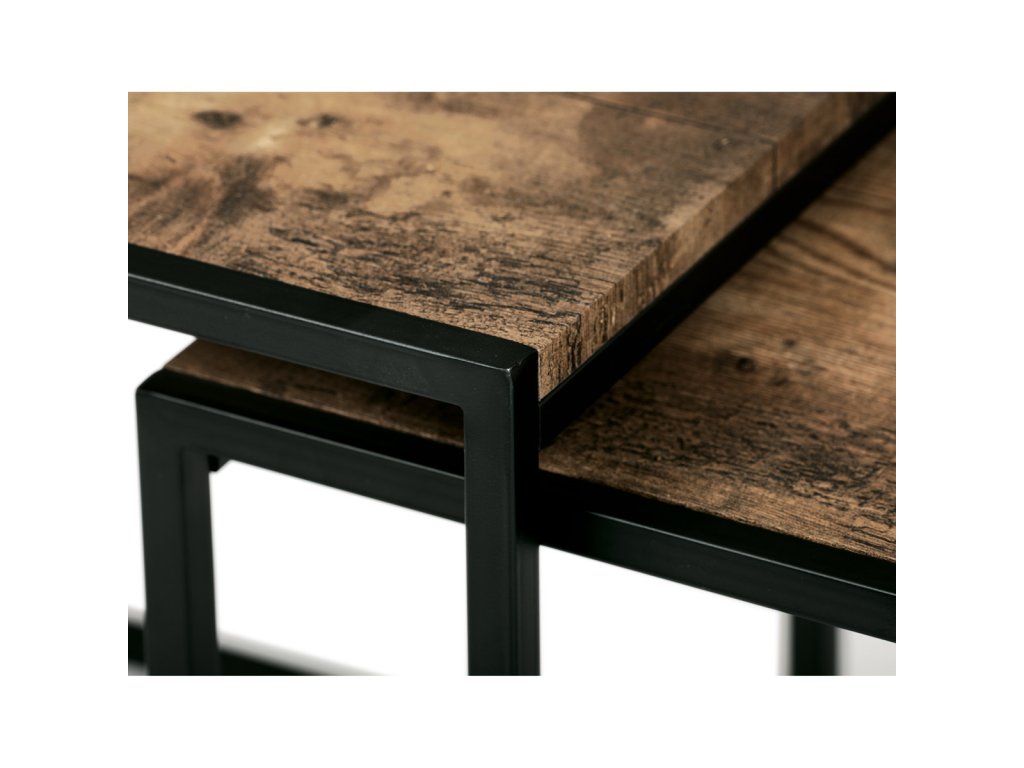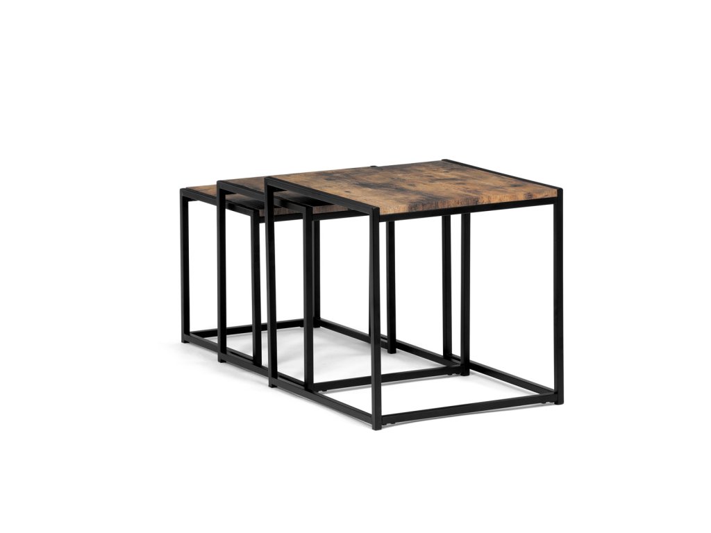 Set 3 ks přístavných nebo odkládacích stolků přinese do Vašeho domova praktičnost, variabilitu, ale také industriální šarm. Stolky můžete rozmístit jednotlivě po interiéru, kde Vám vytvoří zajímavé odkládací prvky v různých výškových hladinách. A nebo společně povytažené, kde vytvoříte velkou obdélníkovou stupňovitou odkládací plochu. Velkou výhodou je možnost zasunutí stolků do sebe, což oceníte při úklidu, skladování nebo při potřebě většího prostoru. Čtvercové desky z MDF v dekoru staré dřevo harmonicky doplňují černá kovová konstrukce, která tvoří rovněž nohy a celkově stolky zpevňuje. Stolek jistě zaujmou nejen svým nadčasovým designem, ale i variabilitou a praktičností. Desky májí rozměr 35 x 35 x 35 , 40 x 40 x 40 a 45 x 45 x 45 cm, tloušťku 1,5 cm. Konstrukce je čtvercového průřezu, na spodních plochách opatřená plastovými kluzáky. Nosnost jednotlivého stolku je do 15 kg.Doplňkové parametry