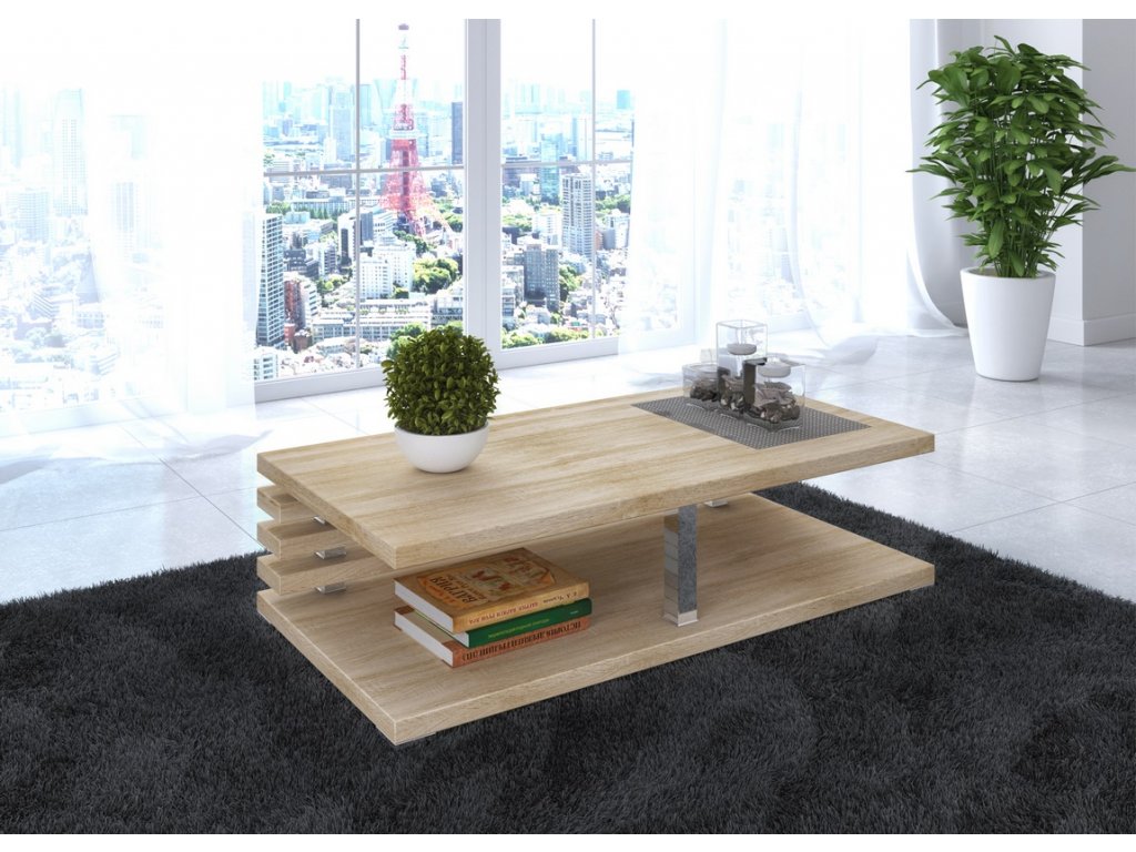 Moderní konferenční stolek z 1,5 cm tlusté MDF desky v dekoru divoký dub a s výškou lubu 10 cm
