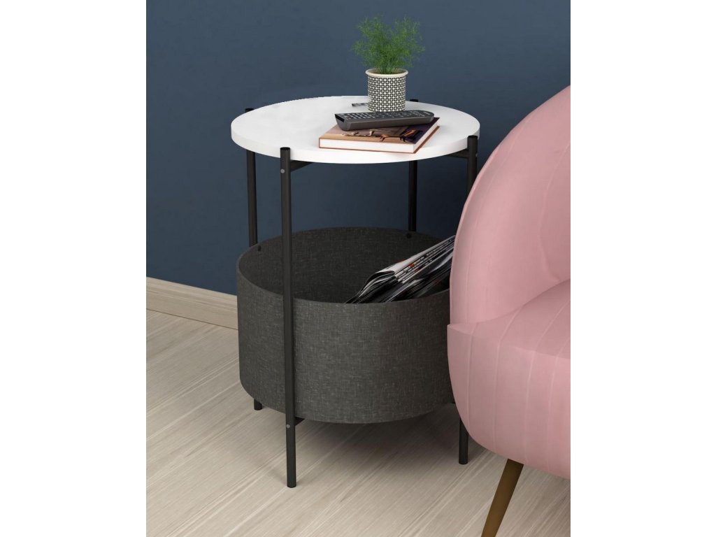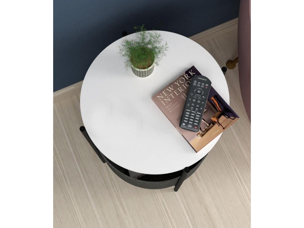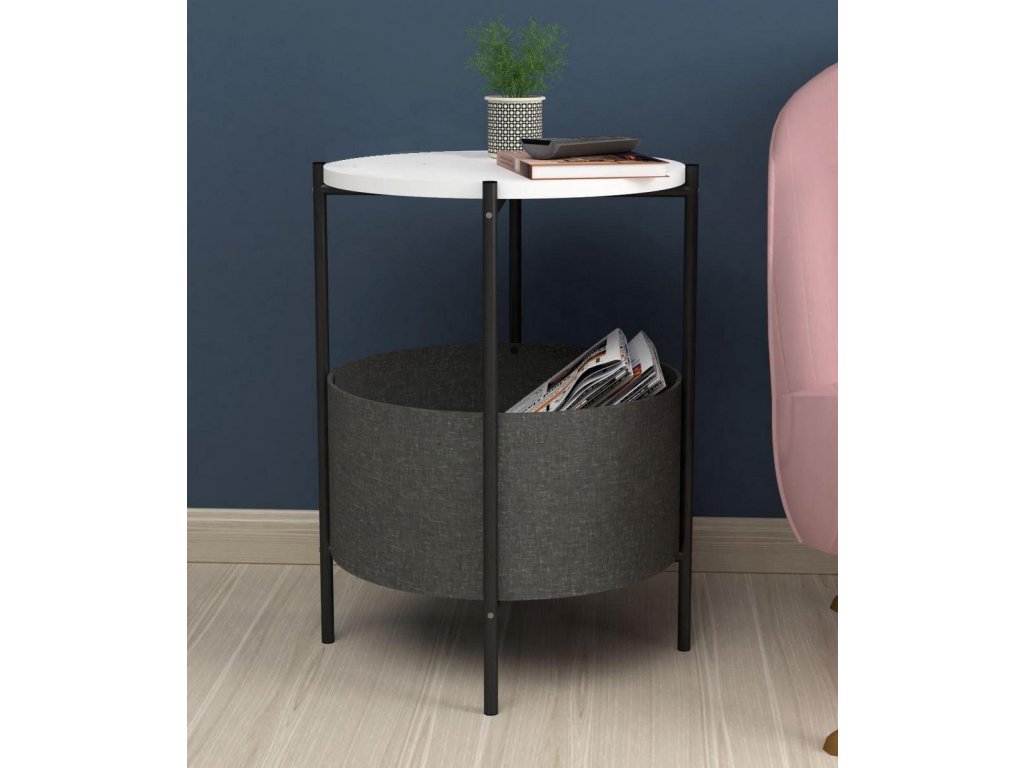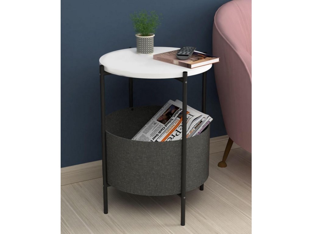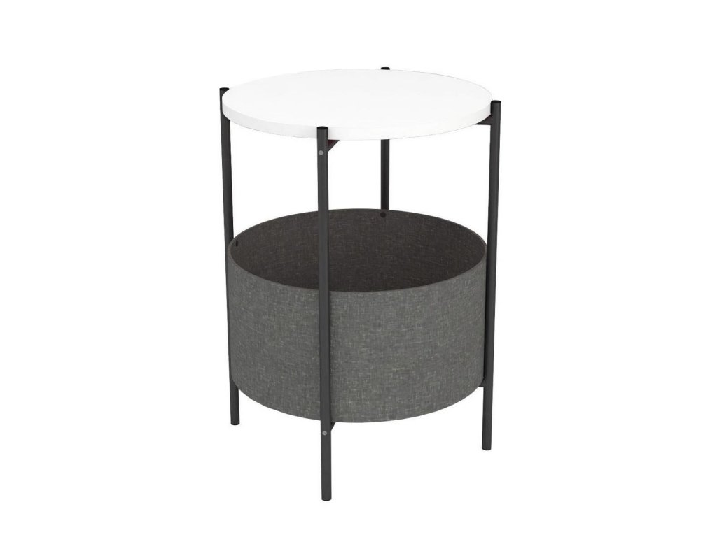 Kulatý konferenční stolek je z kovového rámu v matné černé barvě a horní deska je vyrobena z kvalitní LTD desky. Barevné provedení horní desky je matná bílá. Praktický košík na odkládání věcí je vyrobený z látky a navržený tak, aby bylo možné jej vyjmout a vyprat. Výška košíku je 21,5 cm a průměr je 44,5 cm. Umístění košíku je ve výšce 12 cm od podlahy. Dodáváme v demontovaném stavu.Doplňkové parametry