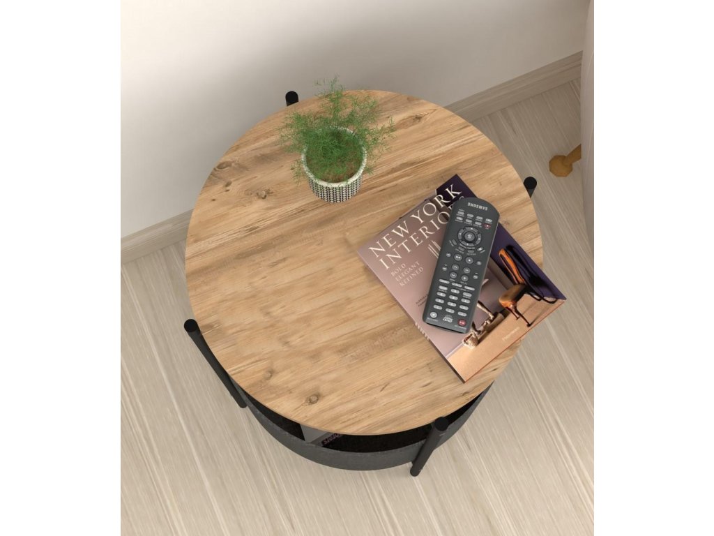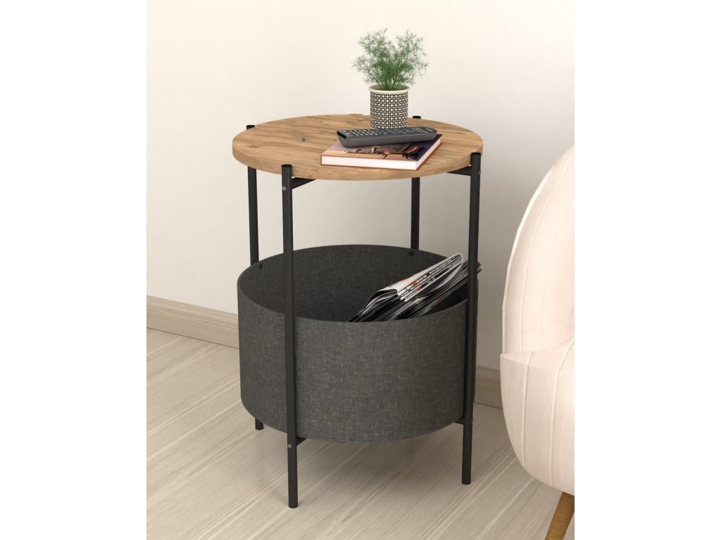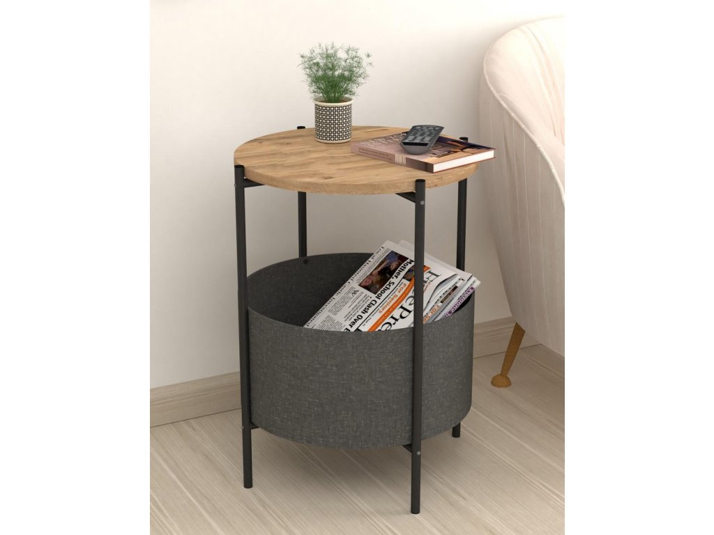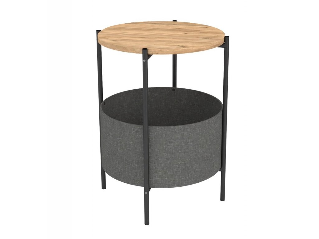 Kulatý konferenční stolek je z kovového rámu v matné černé barvě a horní deska je vyrobena z kvalitní LTD desky. Barevné provedení horní desky je borovice. Praktický košík na odkládání věcí je vyrobený z látky a navržený tak, aby bylo možné jej vyjmout a vyprat. Výška košíku je 21,5 cm a průměr je 44,5 cm. Umístění košíku je ve výšce 12 cm od podlahy. Dodáváme v demontovaném stavu.Doplňkové parametry