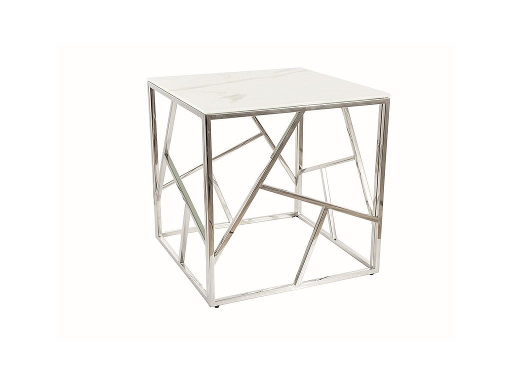 Konferenční stolek v moderním stylu glamour. Konstrukce stolku je z pochromovaného kovu ve stříbrné barvě, vrchní deska je z tvrzeného skla s efektem bílého mramoru. Tento stylový kousek v netradičním designu se bude vyjímat v každém interiéru. Dodáváme v demontovaném stavu.Doplňkové parametry
