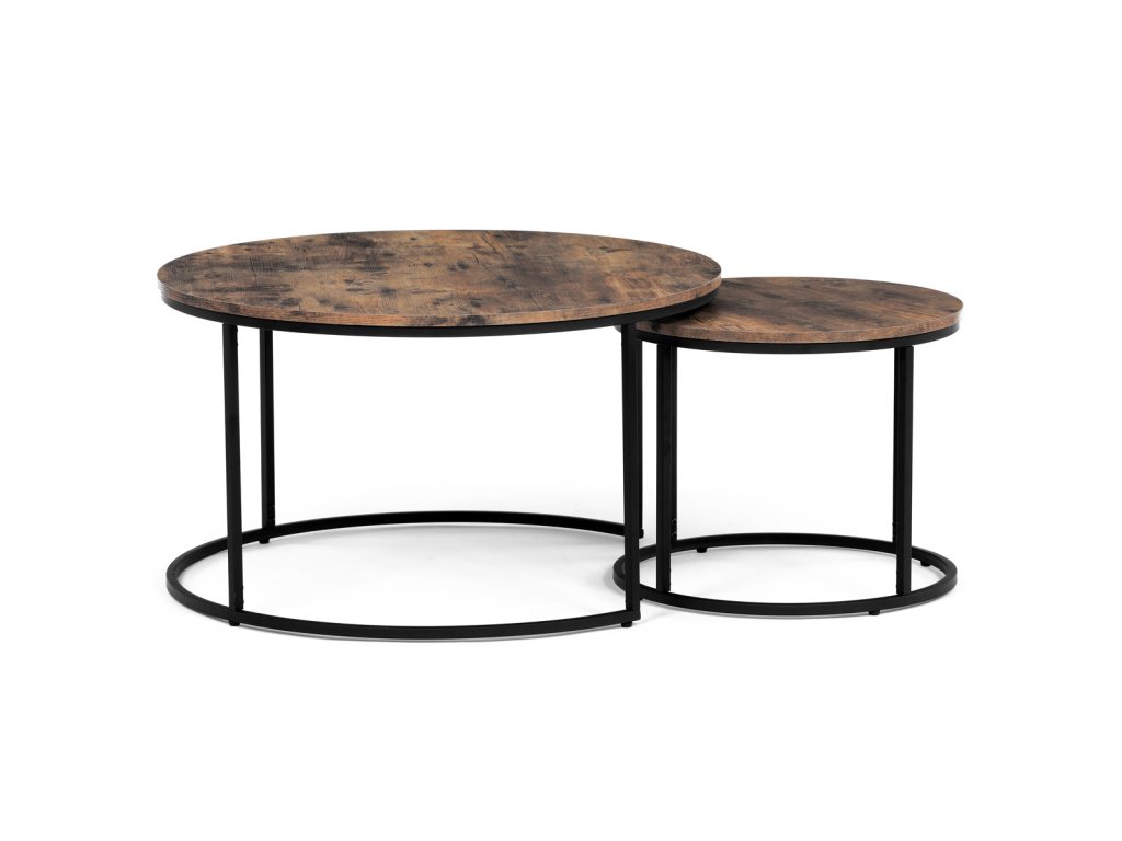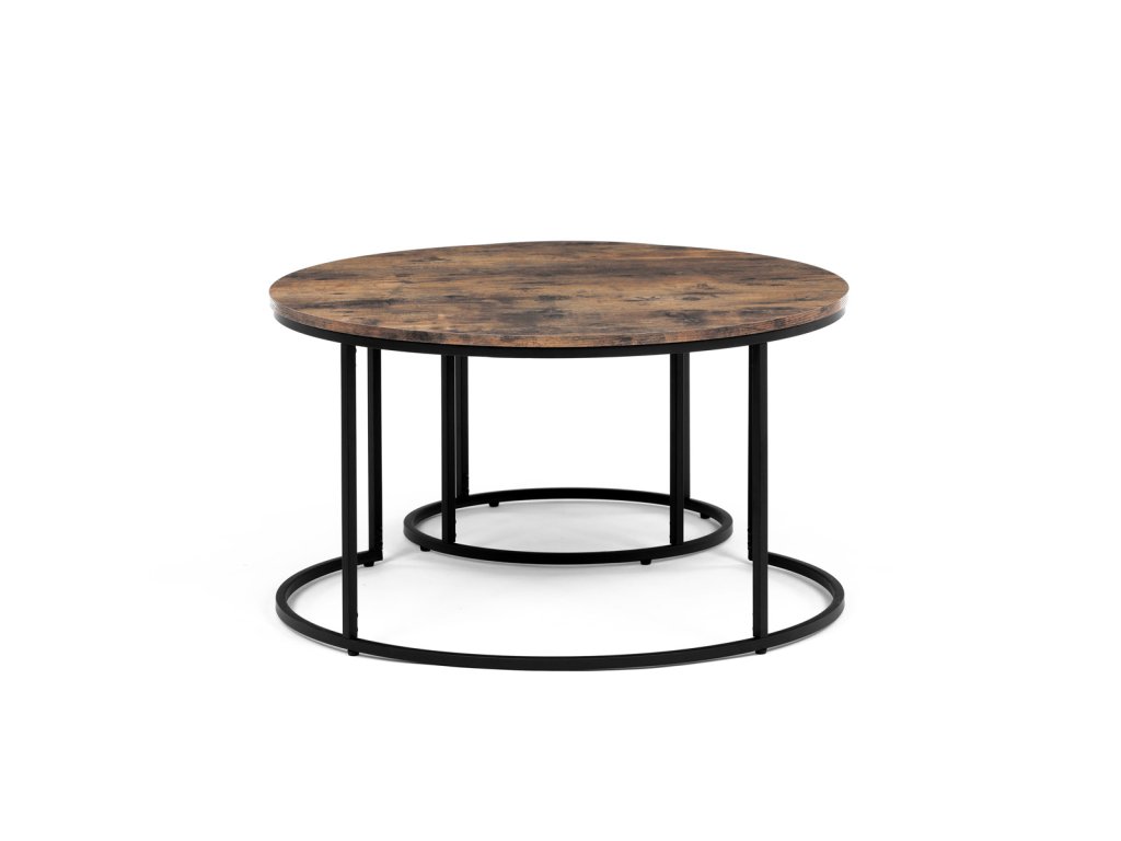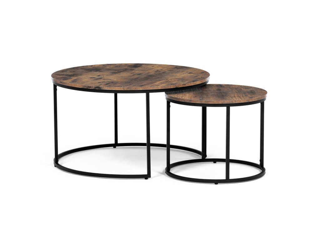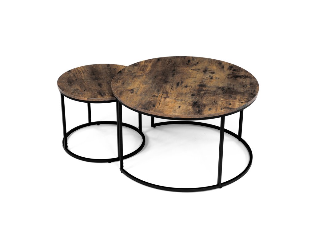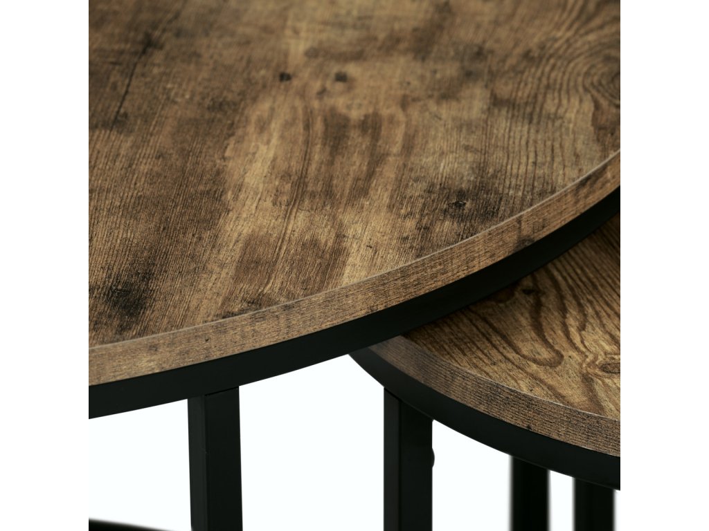 Set 2 ks konferenčních, ale i přístavných nebo odkládacích stolů přinese do vašeho domova nejen praktičnost, variabilitu, ale také industriální šarm. Stolky můžete rozmístit jednotlivě po interiéru, kde Vám vytvoří zajímavé odkládací prvky v různých výškových hladinách. A nebo společně povytažené, kde vytvoříte velkou odkládací plochu ve tvaru čísla 8. Velkou výhodou je možnost zasunutí stolků do sebe, což oceníte při úklidu, skladování nebo při potřebě většího prostoru. A jistě zaujmou nejen již uvedenou praktičností, ale také svým stroze čistým a nadčasovým designem. Kulaté desky z MDF v dekoru staré dřevo harmonicky doplňuje kovová konstrukce po jejich obvodu v černém matném práškovém nástřiku. Ta tvoří rovněž nohy a celkově stolky zpevňuje. Na spodní liště jsou umístěny černé plastové kluzáky, které zabraňují poškození povrchu podlahy při přesunech stolků. Deska o tloušťce 1,5 cm má průměr velmi příjemných 80 cm, menší 50 cm, výška stolů je 46 a 41 cm4. Konstrukce je čtvercového průřezu. Nosnost jednotlivého stolku je do 30 kg.Doplňkové parametry
