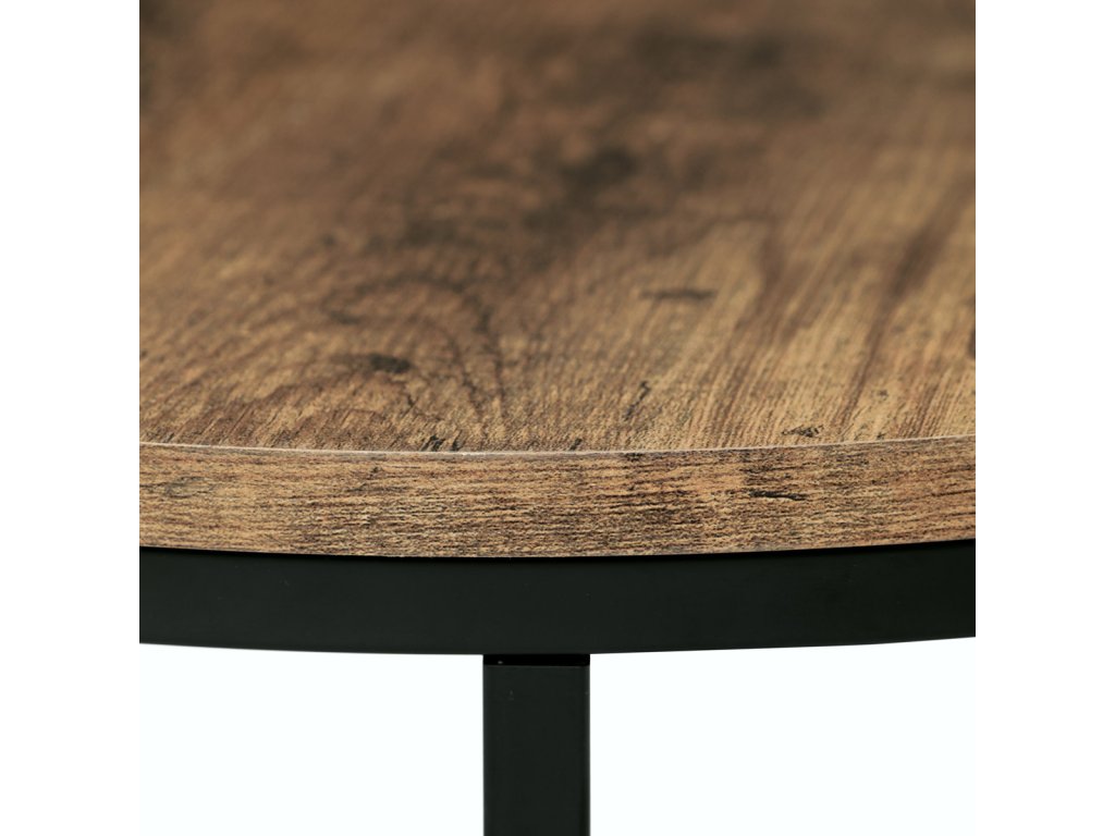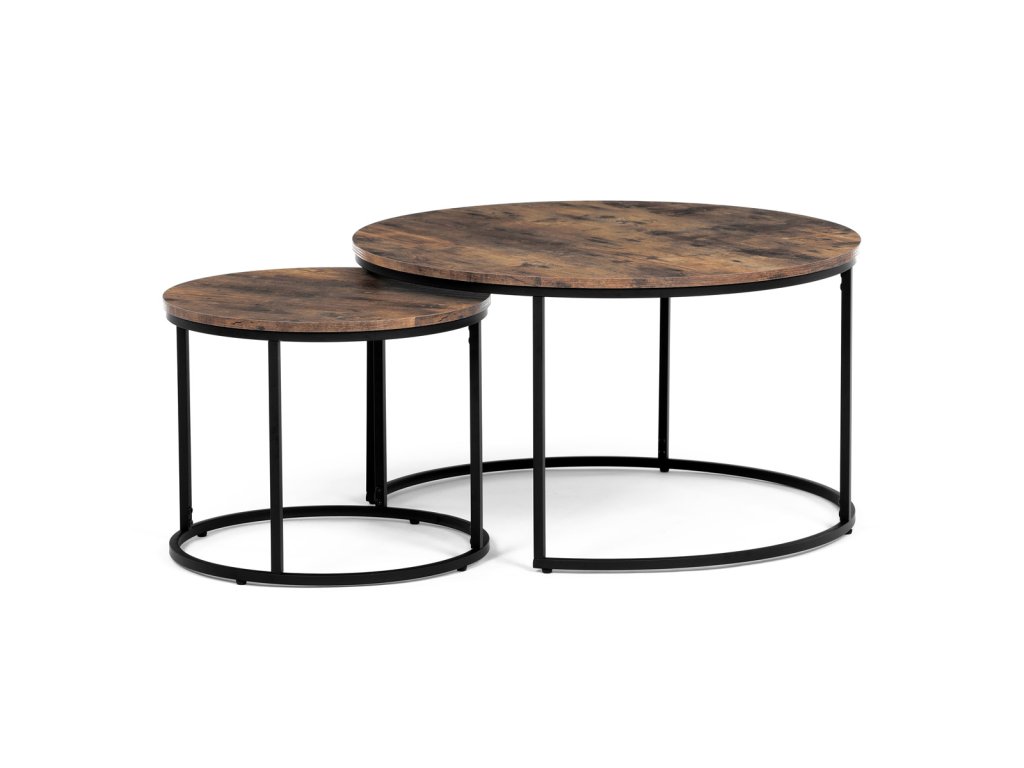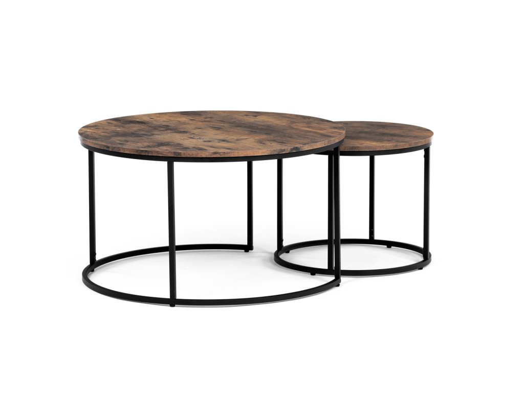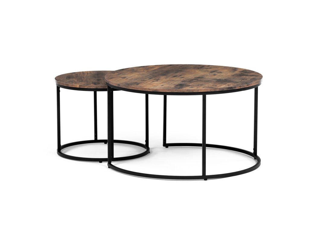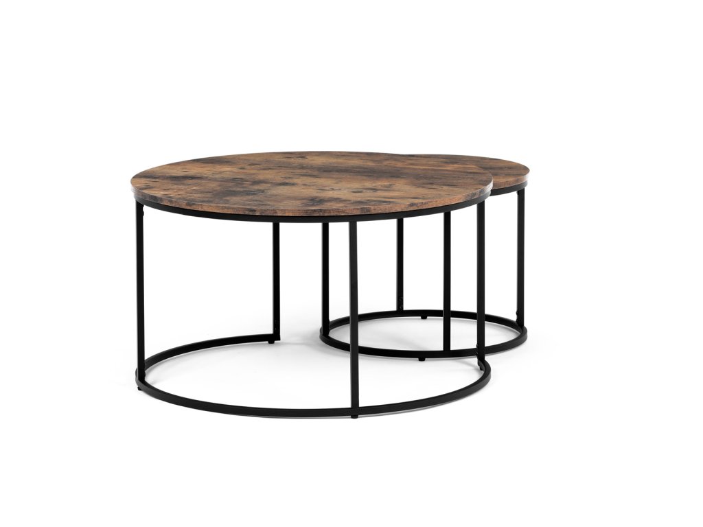 Set 2 ks konferenčních, ale i přístavných nebo odkládacích stolů přinese do vašeho domova nejen praktičnost, variabilitu, ale také industriální šarm. Stolky můžete rozmístit jednotlivě po interiéru, kde Vám vytvoří zajímavé odkládací prvky v různých výškových hladinách. A nebo společně povytažené, kde vytvoříte velkou odkládací plochu ve tvaru čísla 8. Velkou výhodou je možnost zasunutí stolků do sebe, což oceníte při úklidu, skladování nebo při potřebě většího prostoru. A jistě zaujmou nejen již uvedenou praktičností, ale také svým stroze čistým a nadčasovým designem. Kulaté desky z MDF v dekoru staré dřevo harmonicky doplňuje kovová konstrukce po jejich obvodu v černém matném práškovém nástřiku. Ta tvoří rovněž nohy a celkově stolky zpevňuje. Na spodní liště jsou umístěny černé plastové kluzáky, které zabraňují poškození povrchu podlahy při přesunech stolků. Deska o tloušťce 1,5 cm má průměr velmi příjemných 80 cm, menší 50 cm, výška stolů je 46 a 41 cm4. Konstrukce je čtvercového průřezu. Nosnost jednotlivého stolku je do 30 kg.Doplňkové parametry