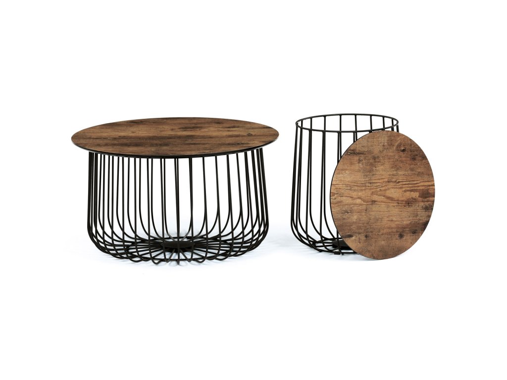 Set 2 ks variabilních a multifunkčních stolků, které můžete využít nejen jako konferenční set, ale skvěle poslouží i jednotlivě jako odkládací nebo přístavné. A to není vše. Po odklopení desky může stolek sloužit jako úložiště nebo odkladiště jistě potřebných věcí v domácnosti, které musíte mít stále při ruce anebo jen jako pokorný dekorativní prvek v interiéru, na který postavíte třeba jen květinu. Variabilita je opravdu neomezená a stačí zapojit fantazii. Co třeba dát dovnitř stolků vlastní květinové aranže či jinak vydekorovat anebo umístit příhodnou živou květinu. Pak už se stačí jen kochat vlastní tvorbou a se zalíbením sledovat závistivé pohledy návštěv. Stolky jsou v lehkém minimalistickém designu ve velmi oblíbeném industriálním stylu. Desky jsou z MDF tl. 18 mm, ze spodní části v černém matu se sraženou obvodovou hranou a v horní pohledové v 3D dekoru staré dřevo. Drátěná kovová konstrukce ze subtilních kulatých profilů je v černém matu, povrchová úprava je kvalitním práškovým vypalovacím lakem. Ve spodní části jsou gumové patky, které zamezují poškození povrchu tvrdých podlah a zároveň zabraňují i nechtěnému posunu stolků. Větší stolek má průměr desky 60 cm a výšku 34 cm, vyšší má průměr 37 cm a výšku 39 cm. Nosnost stolků je do 30 kg každý. Stolky jsou velmi nenáročné na údržbu, stačí je otřít vlhkým hadříkem s vhodným čistícím prostředkem a už jen vysušit. Tento klad jistě ocení každý, a to nejen při úklidu. A dalším skvělé plus je, že zcela odpadá složitá montáž. Jen opatrně vybalíte, nasadíte desky a stolky jsou připraveny Vám sloužit dlouhá léta a vnést do Vašeho interiéru šarm industriálního stylu.Doplňkové parametry