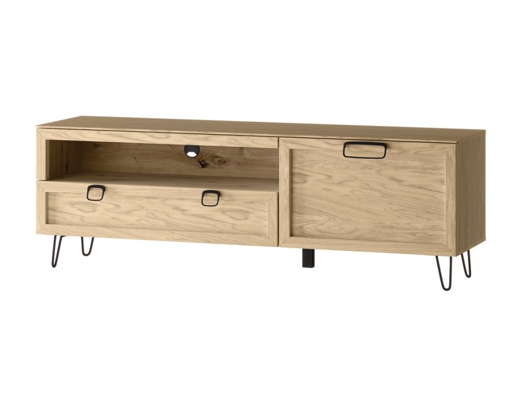 Televizní stolek s výklopnými dvířky a zásuvkou v nadčasovém provedení. Korpus je vyroben z přírodní dýhy v barvě dub artisan, dvířka a čelo zásuvky jsou vyrobeny z masivu v provedení dub artisan olejovaný. Součástí stolku je také LED osvětlení. Úchyty a nožky jsou kovové v barvě černá mat. Dvířka i zásuvka disponují systémem tichého dovírání. Dodáváme již ve smontovaném stavu.Doplňkové parametry