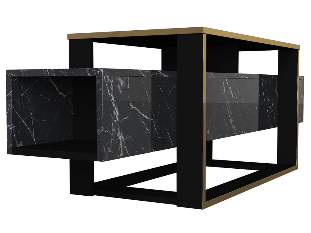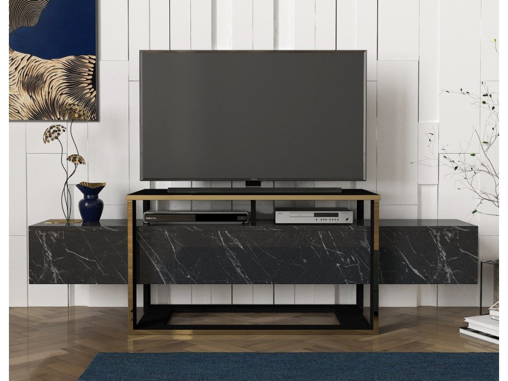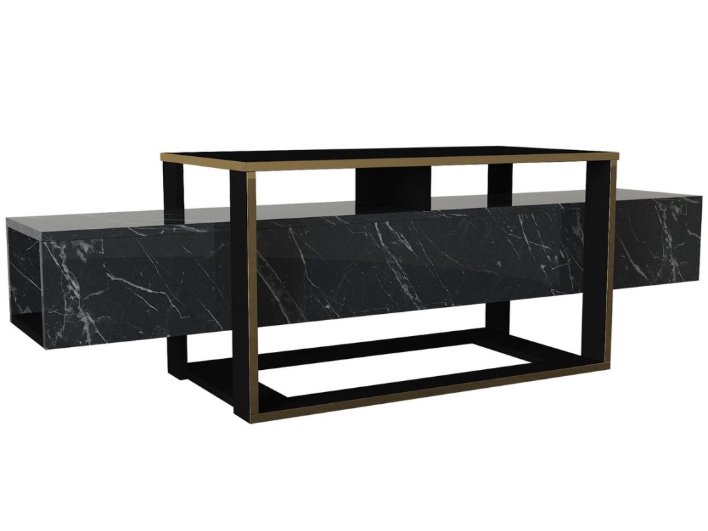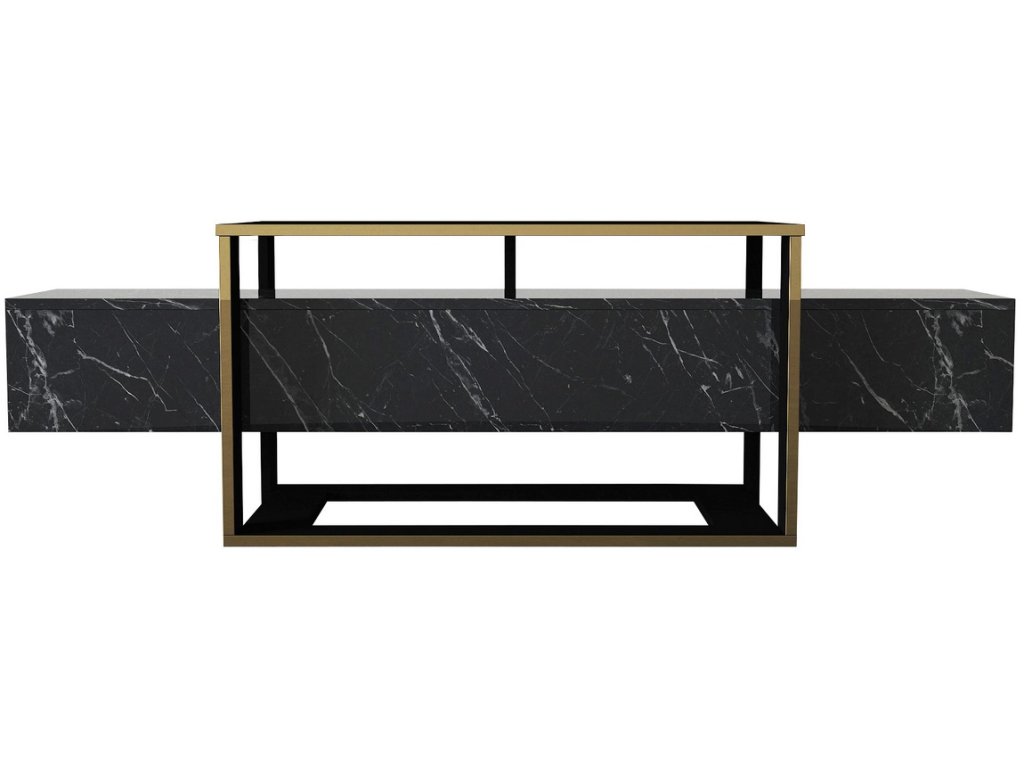 Televizní stolek je vyroben z kvalitního lamina o tl.18 mm hraněné PVC páskou, odolného proti poškrábání v barvě marble. Černá kovová konstrukce je lemovaná zlatou barvou. Na bocích se nachází praktický úložný prostor. Dodáváme v demontovaném stavu.Doplňkové parametry