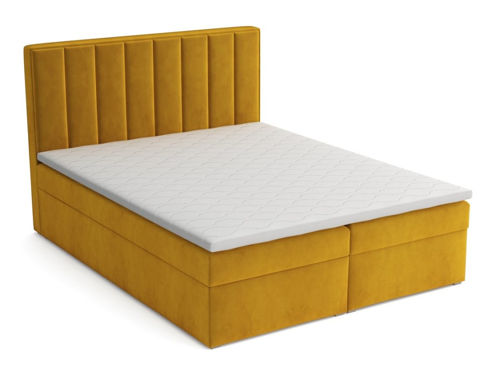Elegantní kontinentální postel moderního vzhledu s vysokým čelem s dekoračním prošíváním. Postel se dodává zároveň s matrací - boxspring styl. Pevná konstrukce postele je potažena látkou v barvě Bluvel 68. Na ní se nachází vysoká bonelová matrace potažena stejnou látkou. Na ní je druhá tenká matrace v celku vyrobena z kvalitní hrubé PUR pěny tzv. topper (výška cca 5 cm). Ložní plocha činí 180 x 200 cm. Výška ložné plochy od země je cca 53 cm. Rozměry úložného prostoru - 2x (197x67x30 cm). Úložný prostor je k dispozici nadzvednutím matrace z boční strany postele.Doplňkové parametry