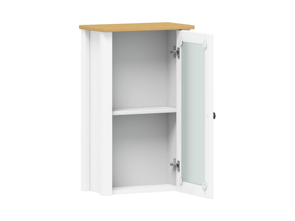 materiál masiv borovice, barevné provedení bílá / buk jedna prosklená dvířka, za nimi jedna police maximální nosnosti uvedeny v návodu k montáži součást sestavy PORTO bílá / bukDoplňkové parametry
