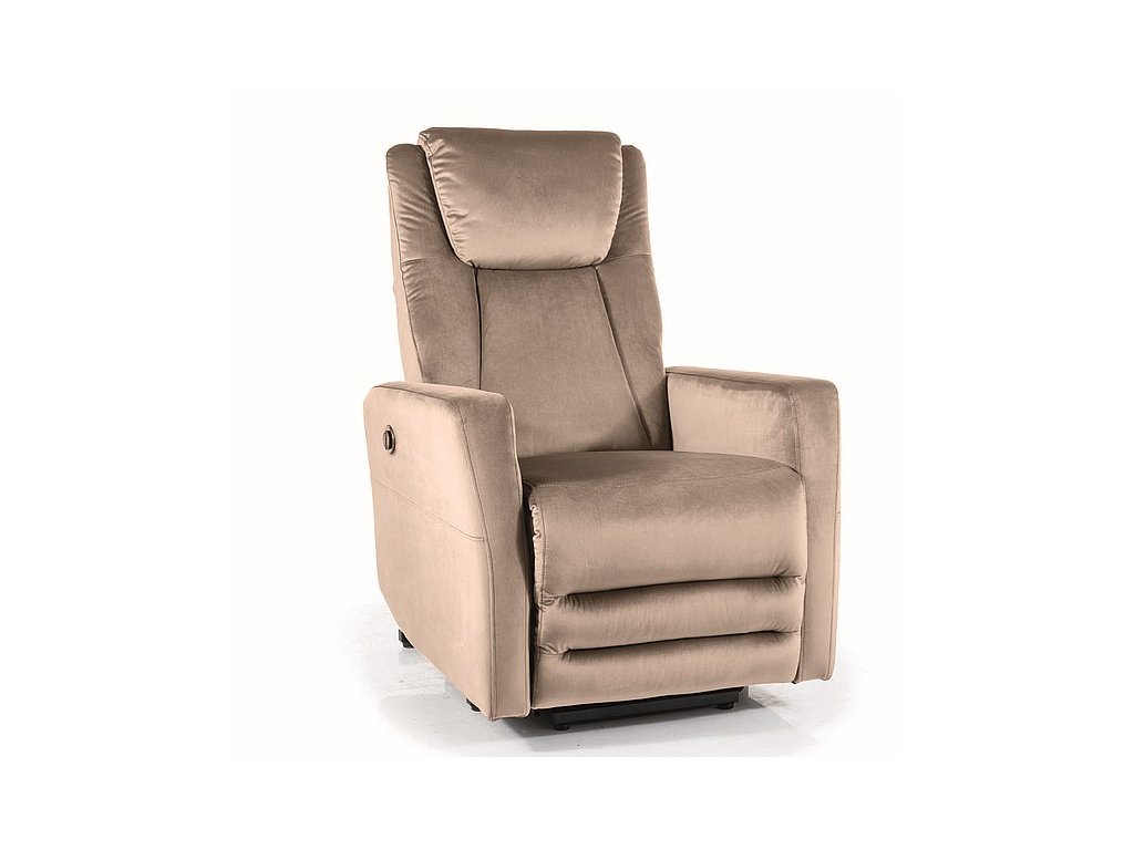 Rozkládací čalouněné křeslo. Rozložení křesla je elektrické (220 V). Jednoduchým pohybem uděláte pohodlnou pohovku s opěrkou pod nohy. Port USB. Čalounění je z látky velvet v béžové barvě (Bluvel 40). Celková hloubka křesla je 96 cm, po rozložení 162 cm. Hloubka sedu je 54 cm, výška sedu 49 cm. Pohodlí a elegance v kvalitním provedení ve Vašem obýváku, dětském pokoji či kanceláři.Doplňkové parametry