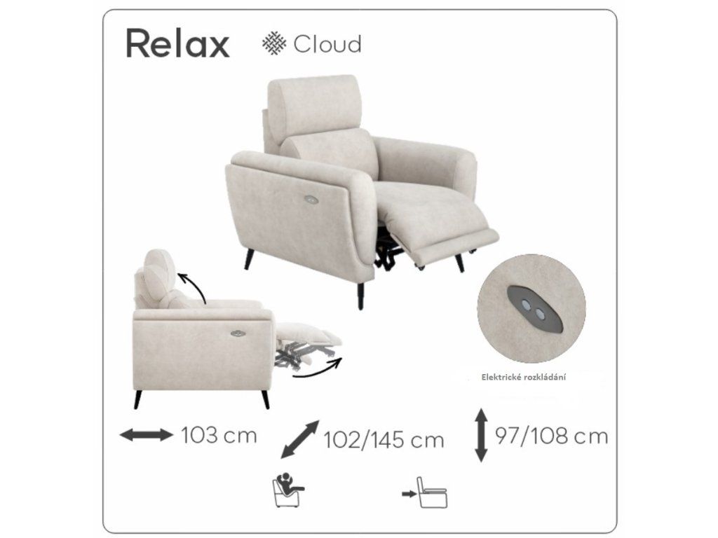 Moderní elektrické křeslo Relax, které spojuje elegantní design, komfort a praktické funkce pro každodenní odpočinek. Díky elektricky nastavitelnému sklápění si snadno nastavíte ideální polohu pro relaxaci, čtení i sledování televize – vše pohodlně stiskem tlačítka. Křeslo je navrženo s důrazem na vysoký komfort sezení. Sedák je vybaven vlnitou pružinou typu B, která zajišťuje optimální pružnost, příjemné ergonomii a stabilní opěrky zad. Elegantní vzhled podtrhuje ozdobné prošívání, plně čalouněné opěradlo a moderní design, díky kterému se křeslo skvěle hodí do současných interiérů. Na výběr je více barevných variant, takže snadno sladíte křeslo s ostatním vybavením vašeho domova.