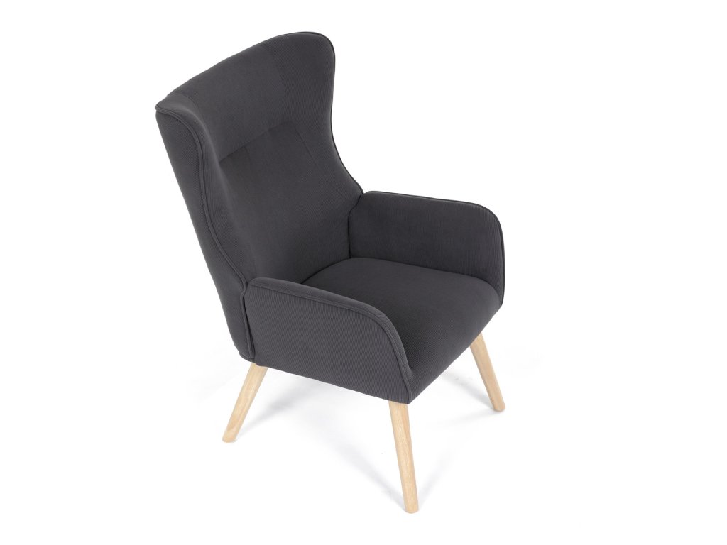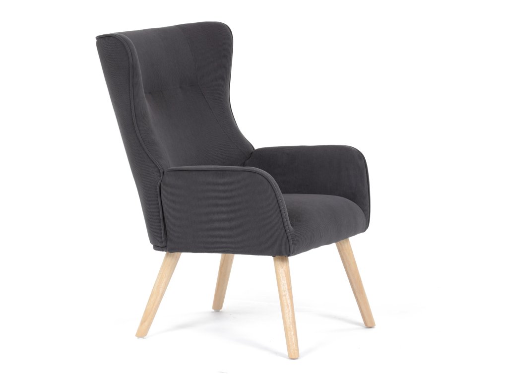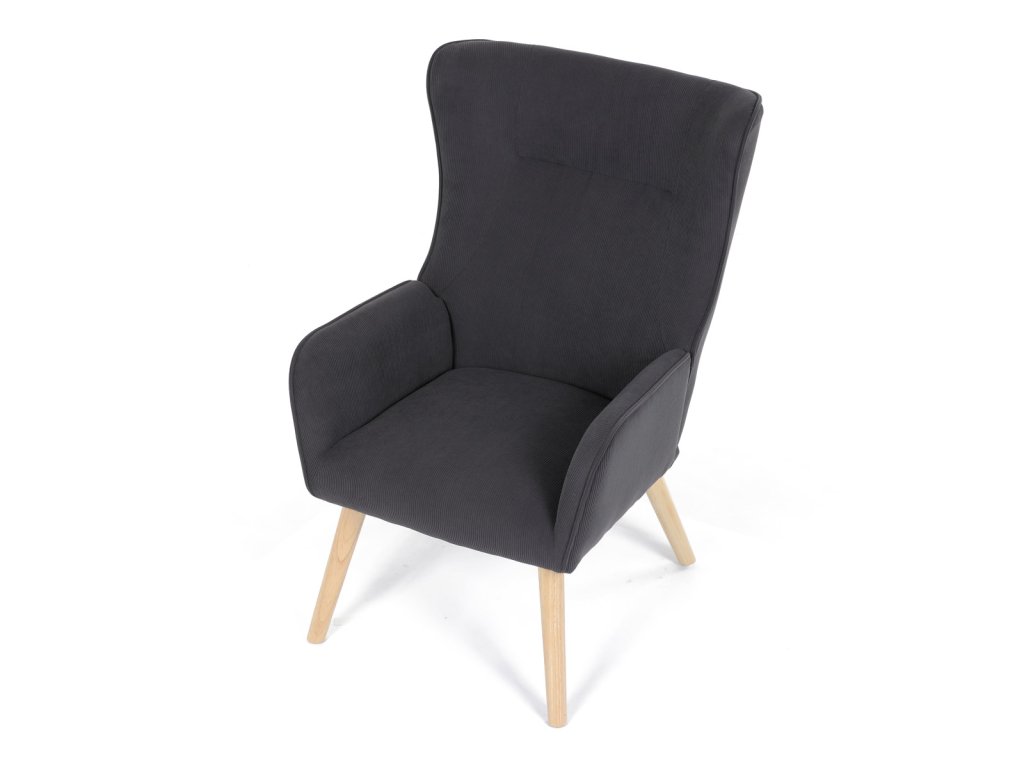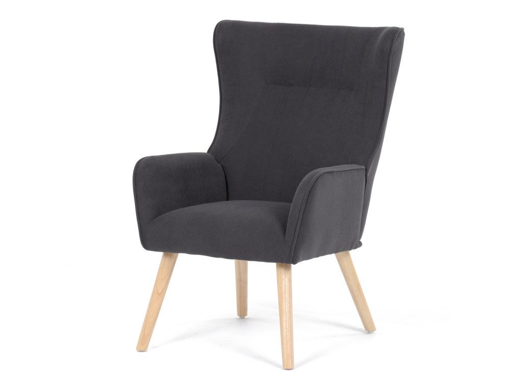 Křeslo, potah šedá manšestrová látka, dřevěné nohy, masiv kaučukovník