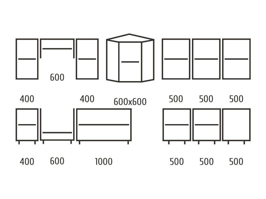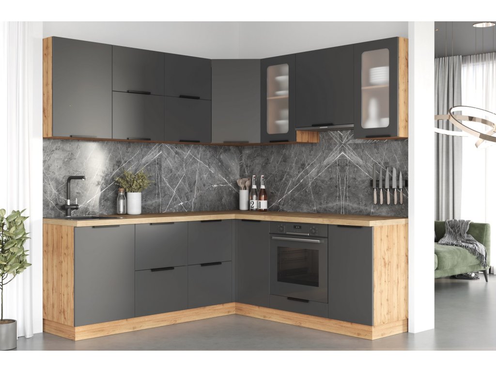 Tato moderní rohová kuchyně kombinuje praktičnost a jednoduchý design. Skříňky se dají poskládat v libovolném pořadí a to Vám umožní si sestavit kuchyni podle svých představ. Korpus a sokl jsou z kvalitní LTD desky v barvě dub apalačský, dvířka jsou z desky MDF tl. 16 mm v barvě ghotic. Úchyty jsou v černé barvě. Sestava se skládá ze spodních skříněk - výška 82 cm, hloubka 47 cm (s pracovní deskou výška 85 cm, hloubka 60 cm), šířka: - 40 cm skříňka 1-dveřová - 50 cm skříňka 1-dveřová pod dřez - 2x 50 cm skříňka se dvěma zásuvkami - 60 cm skříňka na vestavnou troubu - 100 cm skříňka rohová 1-dveřová a vrchních skříněk - výška 72 cm, hloubka 32 cm, šířka: - 2x 40 cm vitrína 1-dveřová - 60 cm skříňka 1-dveřová nad digestoř (výška 57 cm) - 60 x 60 cm skříňka rohová 1-dveřová - 2x 50 cm skříňka 2-dveřová s výklopy - 50 cm skříňka 1-dveřová Kuchyně se prodává jako sestava, dokoupení skříněk není možné. Pracovní deska, spotřebiče, dřez a digestoř nejsou součástí kuchyně. Dřez a pracovní desky k zakoupení najdete v naší další nabídce. Dodáváme v demontovaném stavu.Doplňkové parametry