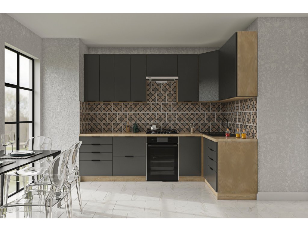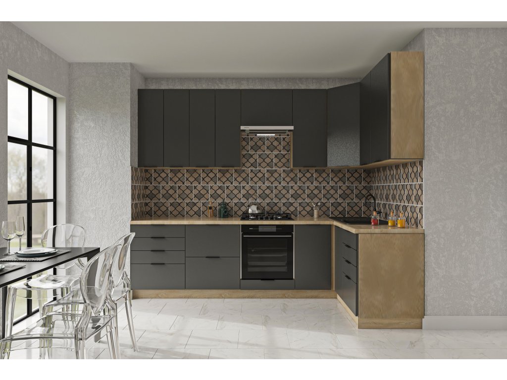Rohová kuchyňská linka 280x140 KROFT R2V grafit/dub sonoma