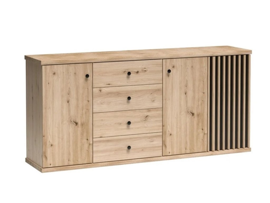 Komoda třídveřová se čtyřmi zásuvkami s netradičním provedením detailu dvířek s lamelami. Kolekce nábytku v sobě spojuje jednoduchost, originální vzhled a funkčnost. Barevné provedení je v kombinaci dub artisan/černá mat. Nábytek je vyroben z kvalitního lamina ohraničeného ABS páskou, dekorační lamely jsou vyrobeny z desky MDF. Zásuvky jsou vybaveny kovovými pojezdy se systémem tichého dovírání. Kolekce se skládá z mnoha prvků a tento široký výběr Vám zaručí sestavit si nábytek podle svých vlastních představ a přání. Dodáváme v demontovaném stavu.Doplňkové parametry