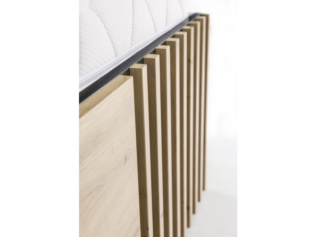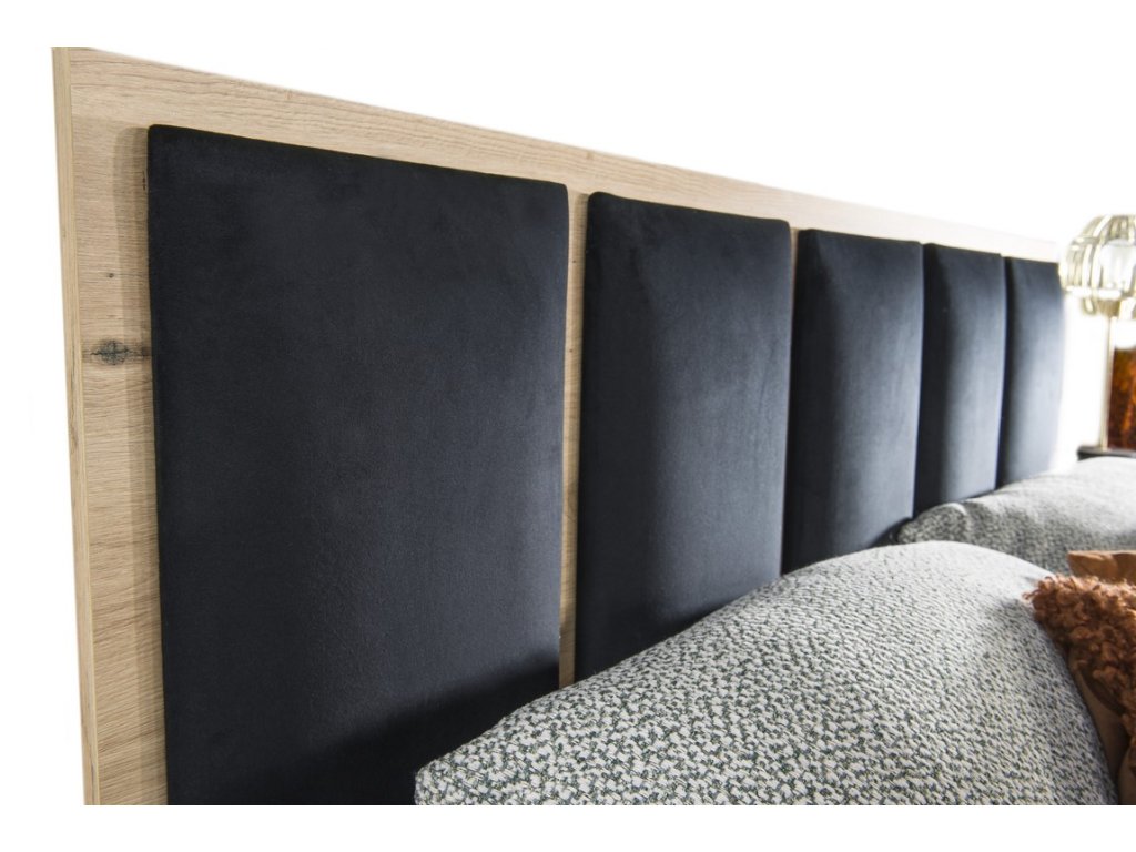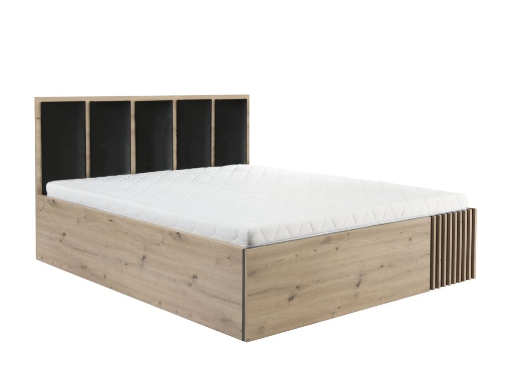 Manželská postel v moderním provedení. Kolekce nábytku v sobě spojuje jednoduchost, originální vzhled a funkčnost. Barevné provedení je v kombinaci dub artisan/černá mat. Nábytek je vyroben z kvalitního lamina ohraničeného ABS páskou, dekorační lamely jsou vyrobeny z desky MDF. Čelo postele je doplněno polstrováním. Součástí postele je lamelový zvedací rošt, díky kterému vznikne praktický úložný prostor. Cena postele je bez matrace, tu je nutno dokoupit. Doporučený rozměr matrace je 180 x 200 cm nebo 2 ks 90 x 200 cm. Kolekce se skládá z mnoha prvků a tento široký výběr Vám zaručí sestavit si nábytek podle svých vlastních představ a přání. Dodáváme v demontovaném stavu.Doplňkové parametry