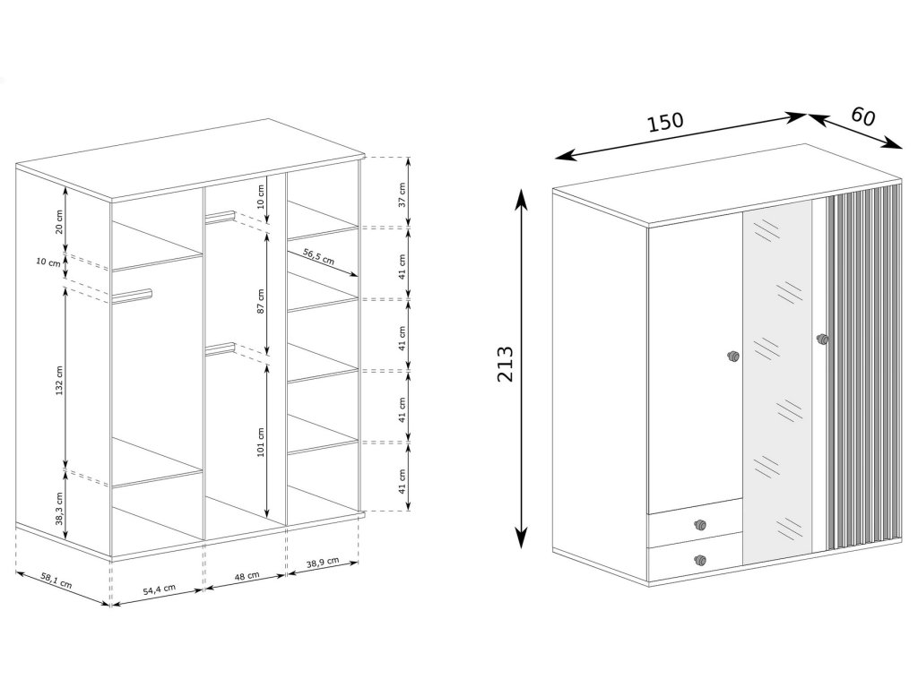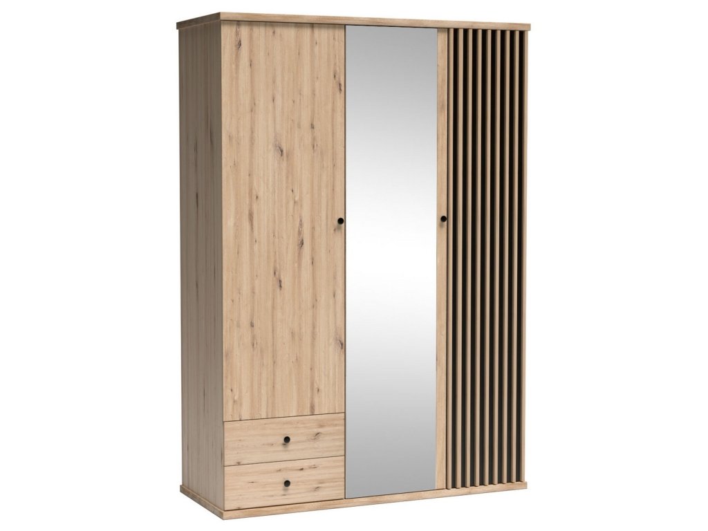 Šatní skříň s třídveřová s netradičním provedením detailu dvířek s lamelami. Kolekce nábytku v sobě spojuje jednoduchost, originální vzhled a funkčnost. Barevné provedení je v kombinaci dub artisan/černá mat. Nábytek je vyroben z kvalitního lamina ohraničeného ABS páskou, dekorační lamely jsou vyrobeny z desky MDF. Uvnitř skříně viz obrázek, Možnost dokoupit další police. Skříň obsahuje zrcadlo. Kolekce se skládá z mnoha prvků a tento široký výběr Vám zaručí sestavit si nábytek podle svých vlastních představ a přání. Dodáváme v demontovaném stavu.